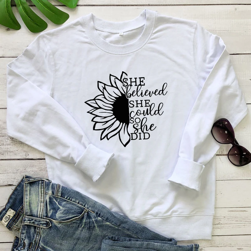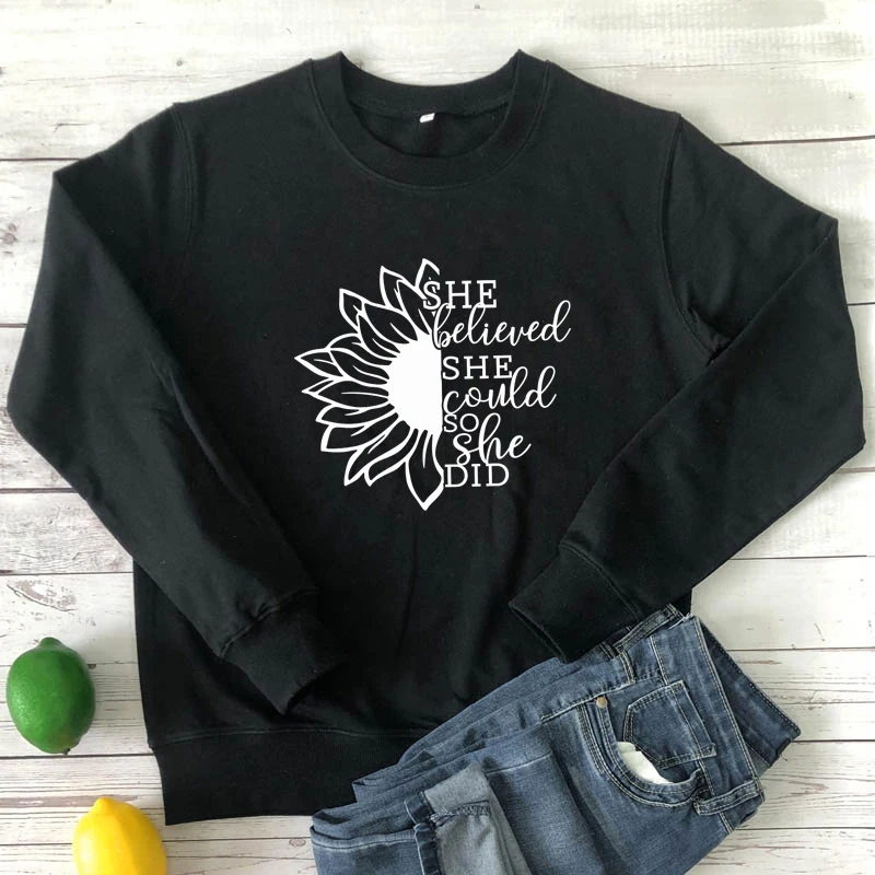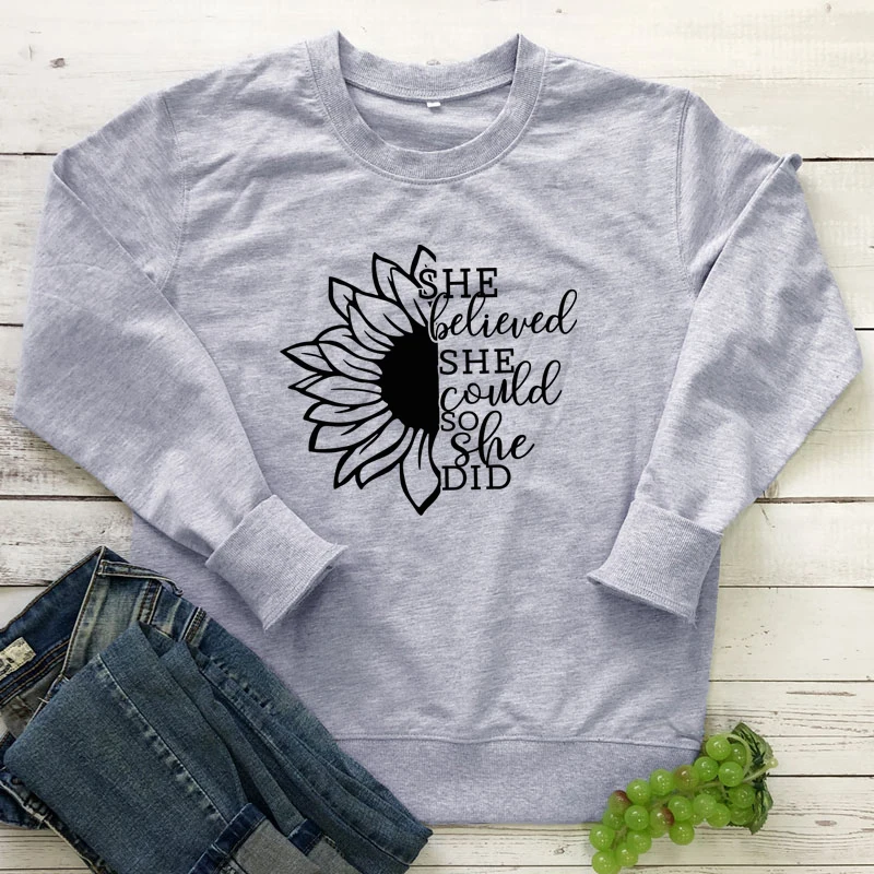 Она верила, что она сможет так и сделала, толстовка, свитшоты с мотивами христианского вдохновения и цитатами, смешные женские пуловеры с подсолнухами