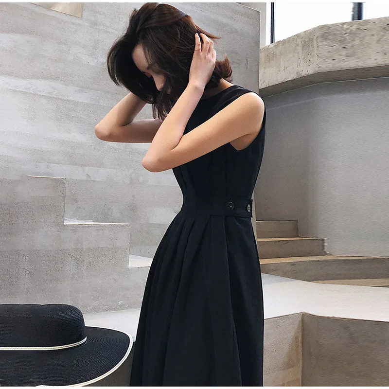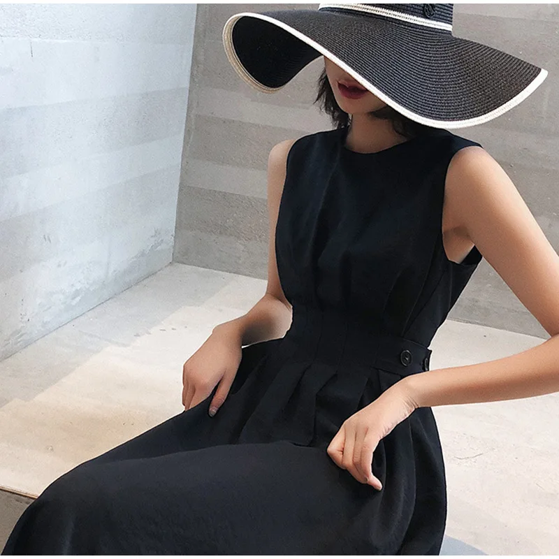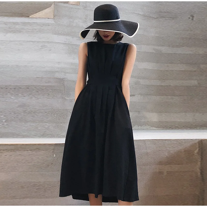 Летнее платье миди без рукавов с карманами, плиссированная туника на пуговицах, ТРАПЕЦИЕВИДНОЕ женское платье, новинка 2020, повседневный женский сарафан на бретелях