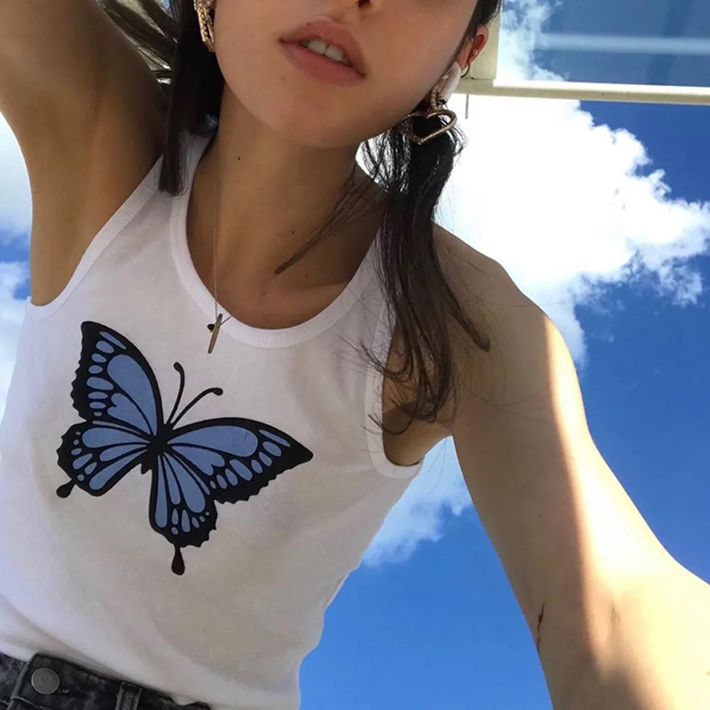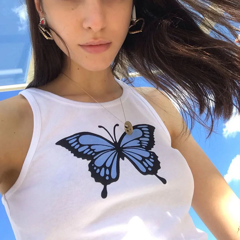 Женские топы без рукавов с рисунком бабочек, летние модные белые укороченные топы с круглым вырезом, уличная одежда, повседневная майка, футболки