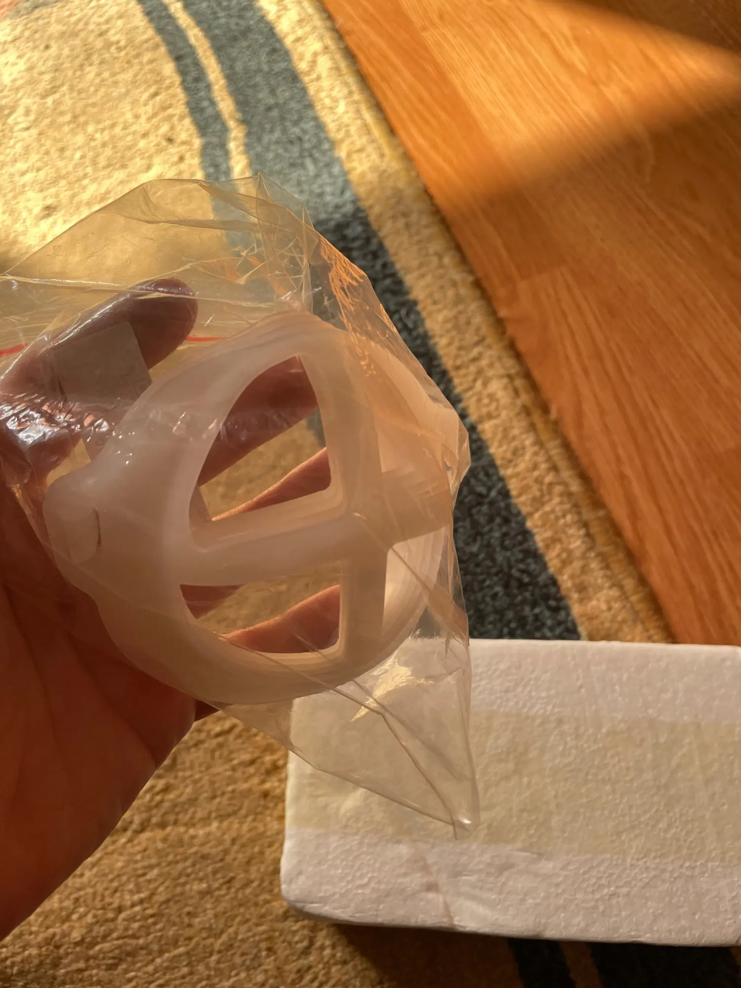 Очень полезная штука, пластиковая, без запаха, но довольно маленькая по размеру У кого лицо по шире предлагаю задуматся перед покупкой.Оста остальным очень рекомендую!
