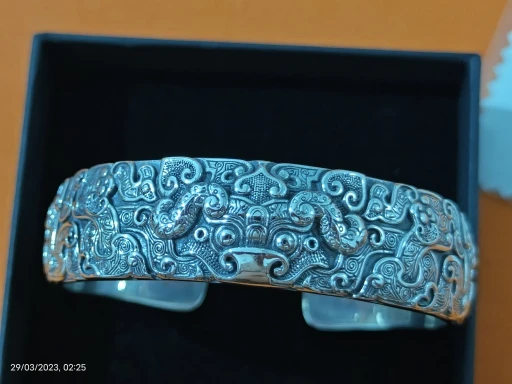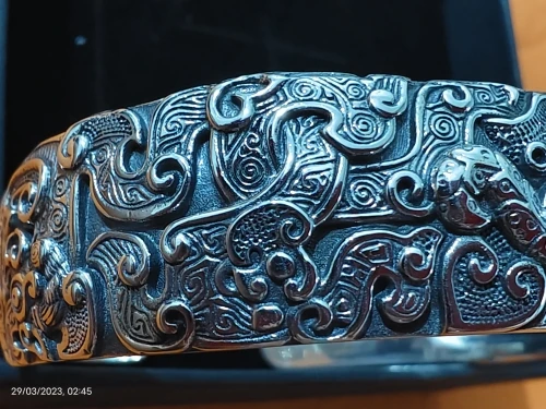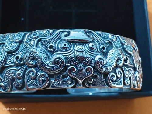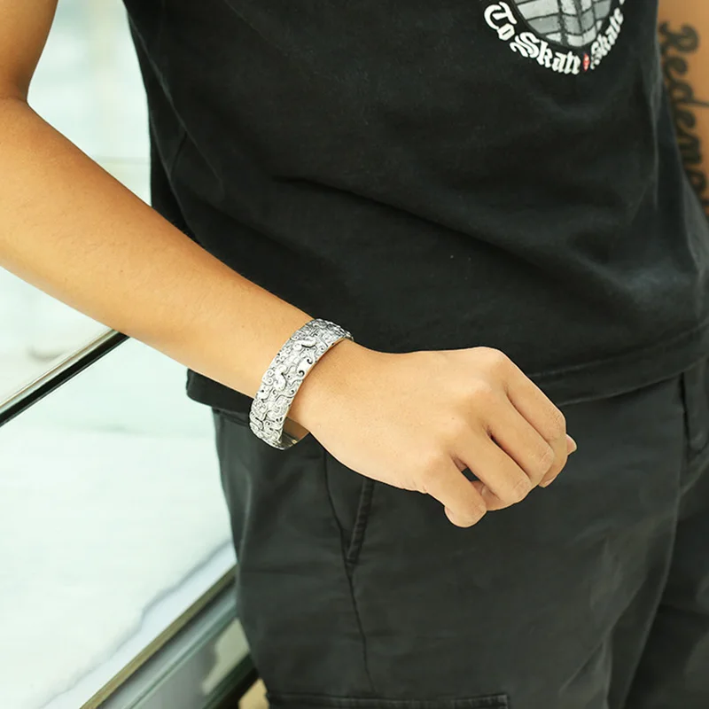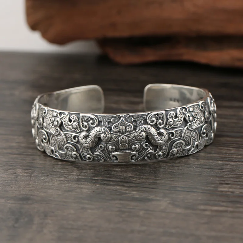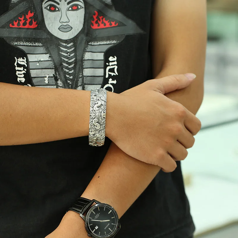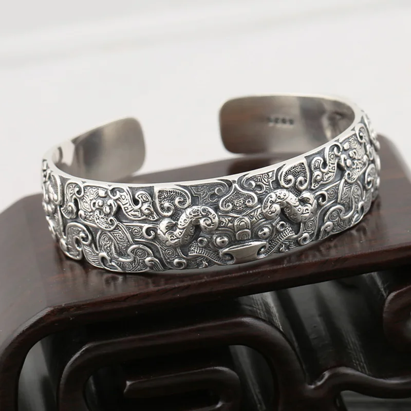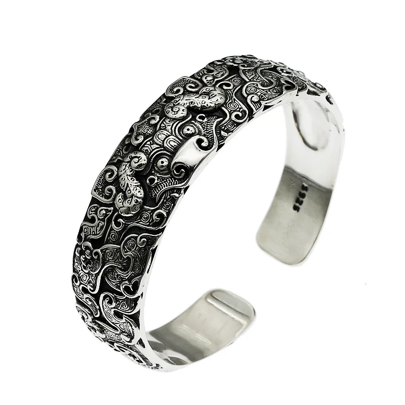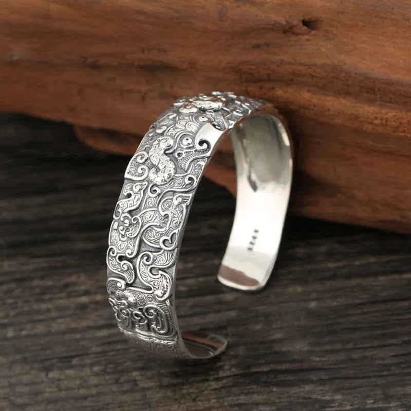 Браслет-манжета мужской, ширина 19 мм, резной этнический незамкнутый браслет с драконом, серебро 925 пробы
