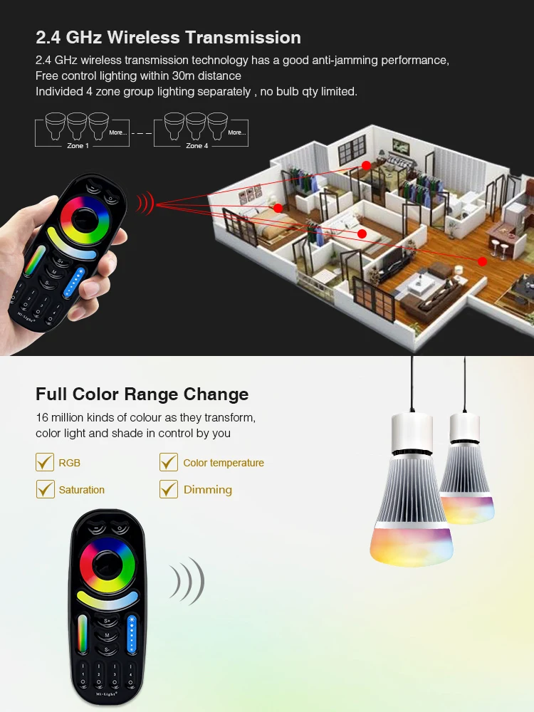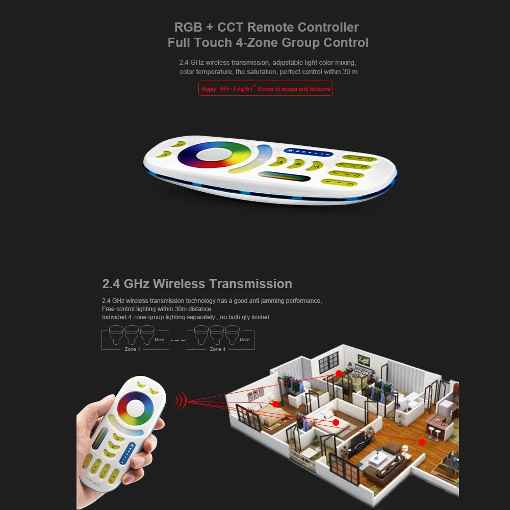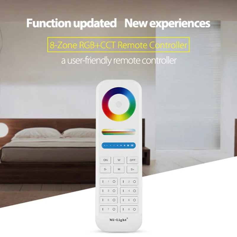 Особенности:1. 8-зоны RGB + CCT дистанционный пульт, удобный для пользователя и пульта дистанционного управления. В каждой зоне нет количества лимитированной лампы. 8 зон, решить вашу проблему отсутствия зон. Множество зон, Управляйте самостоятельно, удовлетворяйте все ваши требования. Одного пульта достаточно для управления разными районами.2. RGB + CCT, 16 миллионов цветов на выбор. Цветовая температура, 2700-6500K.3. Регулировка насыщенности яркости, точность затемнения яркости. Отрегулируйте яркость в соответствии с вашими различными требованиями к использованию, дайте светильник, который вы хотите.4. Супер компактность, беспочвенная передача 2,4G, полностью совместима с сериями RGB + CCT, светодиодными лампами milight, прожекторами и контроллерами 5 в 1, используется беспроводная технология 2,4 ГГц, передача длинного сигнала, лучший опыт управления.
