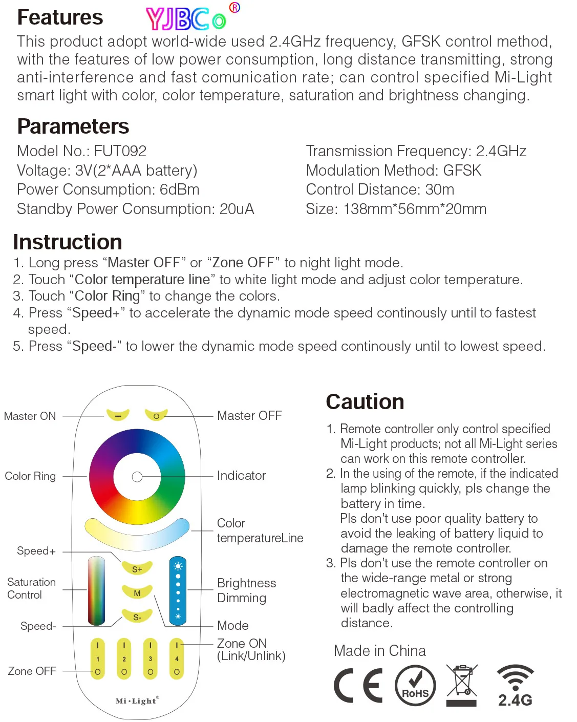 Название продукта: 4 зоны RGB + CCT пульт дистанционного управленияНомер модели: FUT092-BРабочая температура: -20 -60 ℃Напряжение: 3 в (2 * AAA батареи)Частота передачи: 2400-2483,5 МГцМетод модуляции: GFSKМощность передачи: 6 дБмРасстояние управления: 30 мМощность в режиме ожидания: 30uAРазмер: 56*20*138 мм