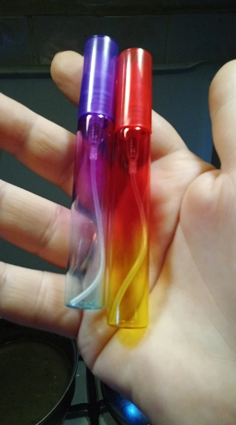Заказала 6.05, получила 28.05 в Минск. Каждая бутылка в посылке в отдельном пакете, всё цело, без царапин. Бутылки из тонкого цветного стекла, колпак из прозрачного цветного пластика. Размер бутылки 8 мл 9,9 см с колпаком, 6,8 см стеклянной части, диаметр 1,35 см.