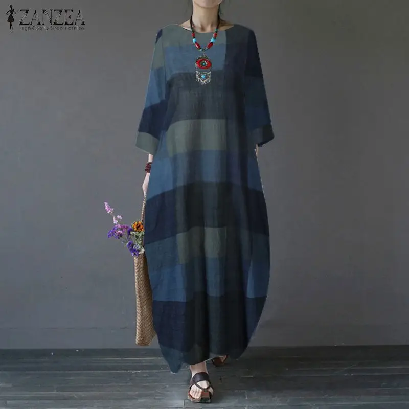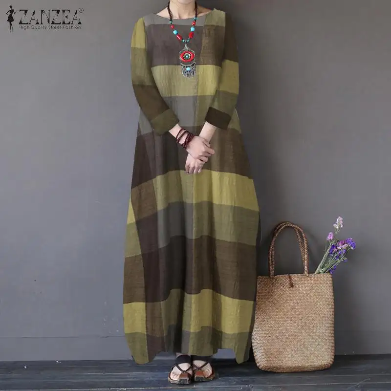 2022 ZANZEA осеннее клетчатое платье с рукавом 34, женское винтажное длинное платье макси, женский свободный сарафан, халат, повседневный кафтан, Vestido
