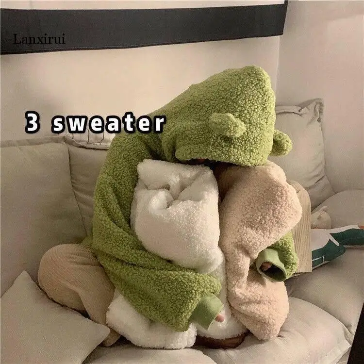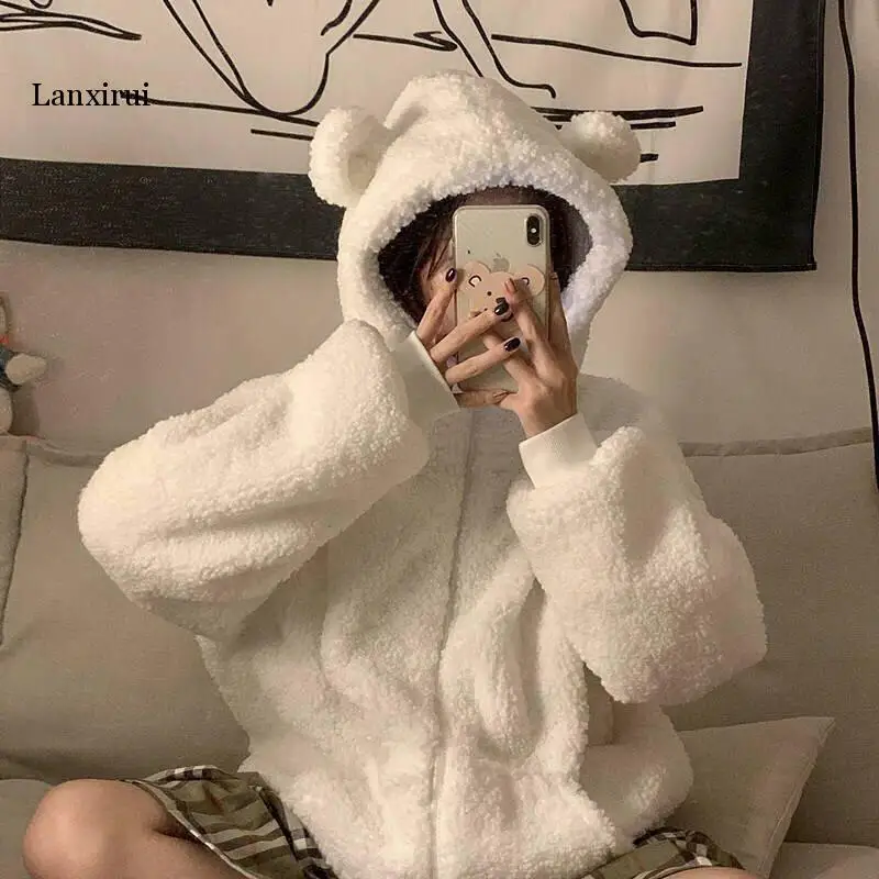 Женское флисовое пальто с капюшоном, Свободное пальто с круглым воротником и имитацией овечьей шерсти, милые толстовки с капюшоном