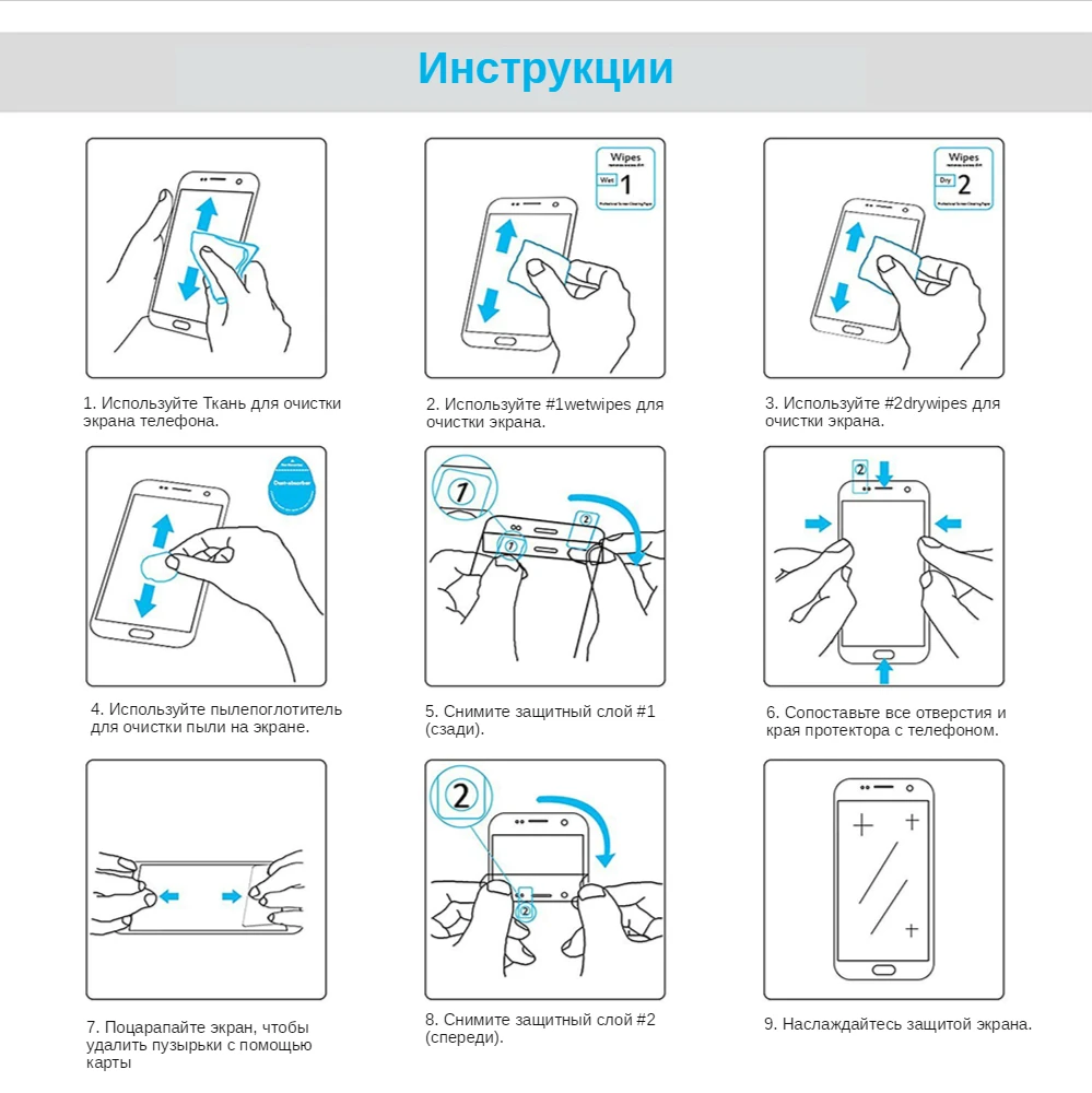 Инструкция по использованию: Шаг 1:Тщательно очистите ЖК-экран тканью для очистки.Step2:Аккуратно снимите маску с наклейкой. Раскройте 1/2 дюйма протектора экрана, не прикасайтесь к клейкой стороне.Шаг 3:Аккуратно выровняйте протектор экрана по краю ЖК-экрана.Шаг 4:Снимите маску по завершении нанесения. Посылка в комплекте Экран протекторТкань для очистки