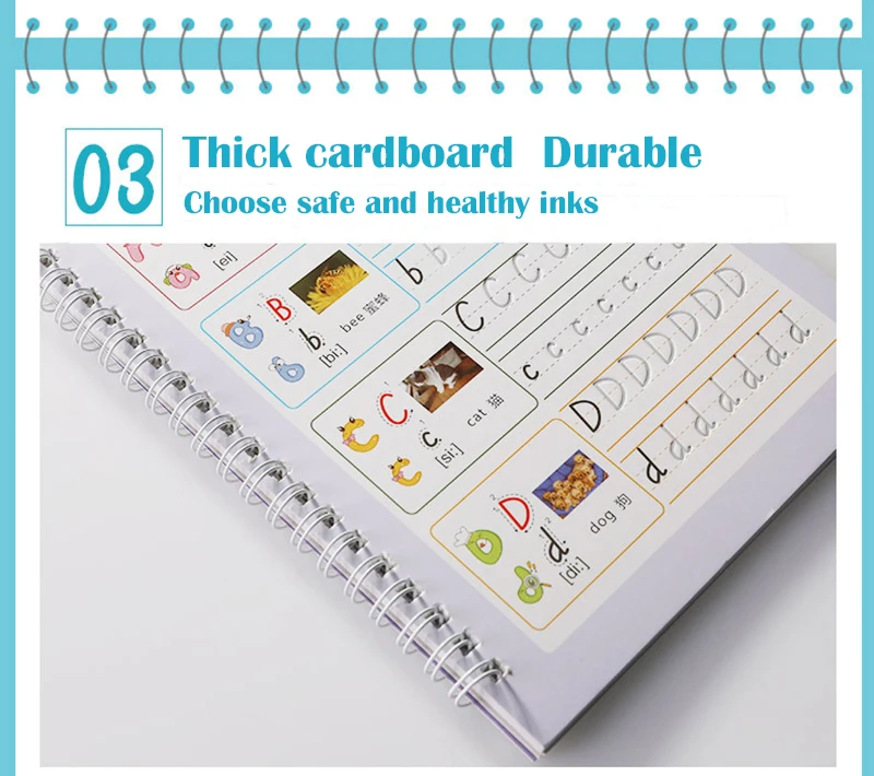 Примечание для покупателей: Этот продукт улучшен и модернизирован. Цвет внутренней страницы меняется с фиолетового на розовый. Дизайн шрифта больше подходит для детей. Многоразовая тетрадь с английским алфавитом, игрушки для рисования, ручное письмо, автовыцветающие обучающие игрушки для детей, школьные принадлежности Содержание продукта: Тетрадь * 1, Держатель для ручки * 1, Чехол для ручки * 1, Специальный стержень * 6