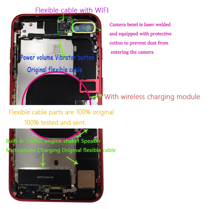 1: гибкий кабель с WIFI2: встроенный TAPTIC двигатель Вибратор ДинамикОригинальный гибкий кабель для зарядки микрофона3: оригинальный гибкий кабель с кнопкой регулировки громкости вибратора4: рамка для камеры сварена лазером и оснащена защитным хлопком для предотвращения попадания пыли в камеру5: гибкие части кабеля являются 100% оригинальными, 100% протестированы и отправлены.Упаковка включает:1,1 шт задняя крышка батареи + слот для sim-карты2. 1 комплект винтов3. 1 водонепроницаемый стикер.4. 1 шт. стикер батареи.5. 1 Набор инструментов для ремонта. (Примечание: инструменты отправляются бесплатно, не включены в цену, инструменты универсальны, не могу убедиться, что они подходят для каждого продукта, пожалуйста, поймите.)Винты с полным набором