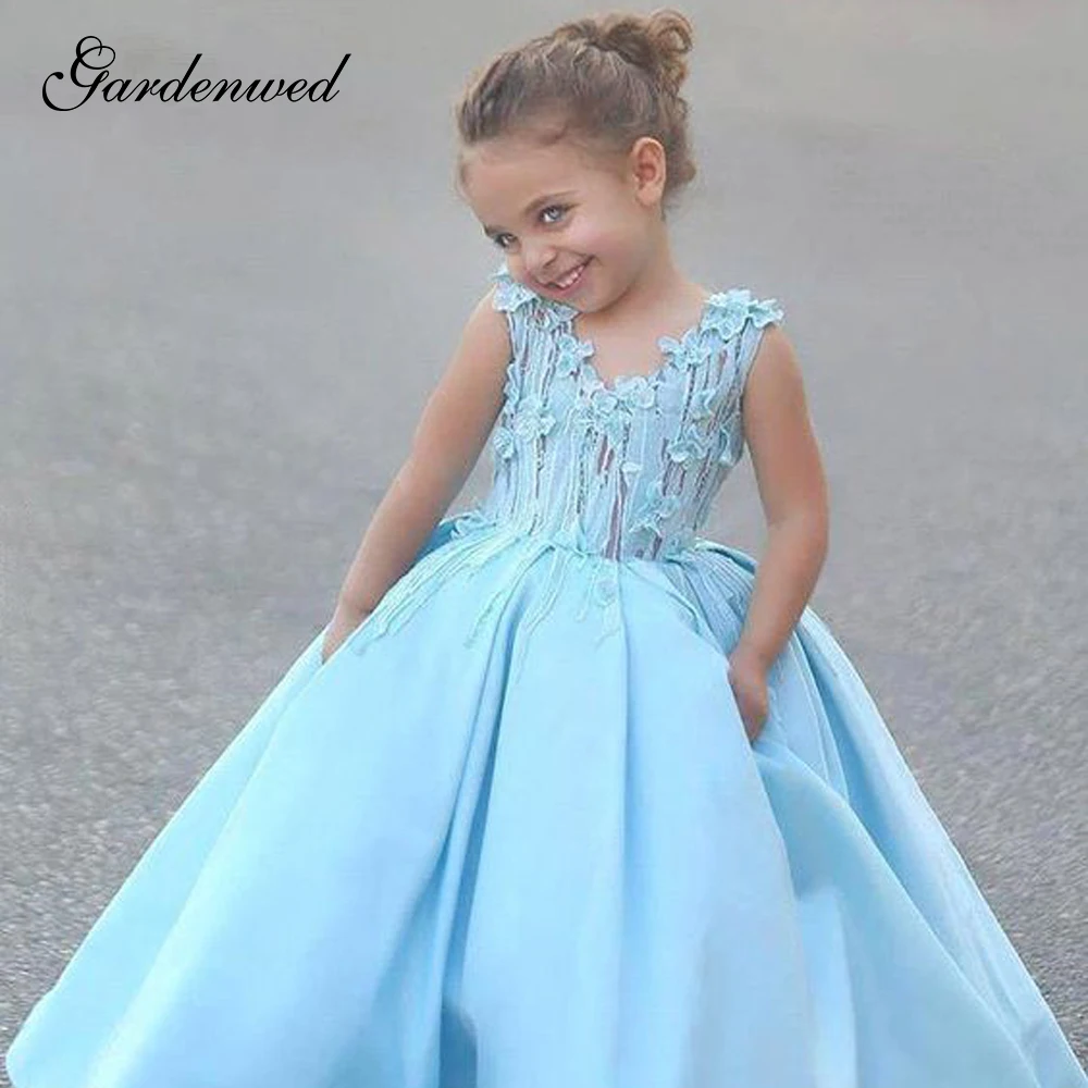 Платья для девочек с милыми голубыми цветами и кружевной аппликацией длинное детское платье без рукавов бальное платье из органзы с вышивкой Vestidos