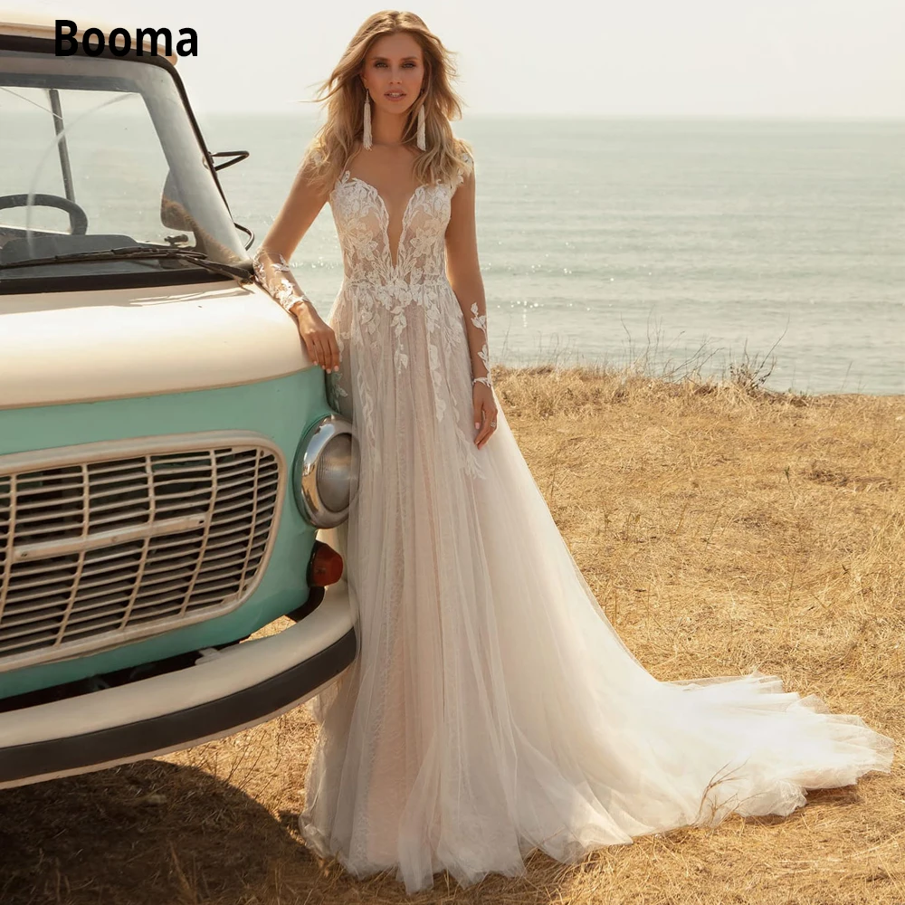 Пляжное свадебное платье Booma цвета шампанского в стиле бохо, женское кружевное искусственное Тюлевое платье с длинным рукавом