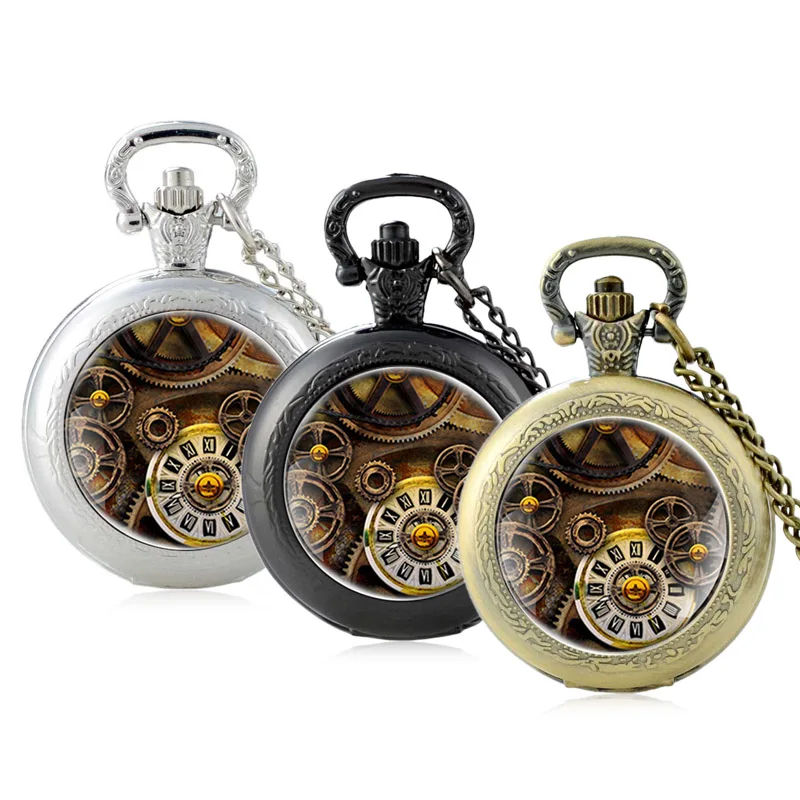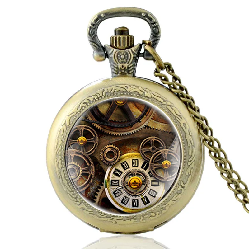 Классические бронзовые дизайнерские стеклянные кварцевые карманные часы с кабошоном в стиле стимпанк, винтажные мужские и женские часы с подвеской и цепочкой, подарочные украшения