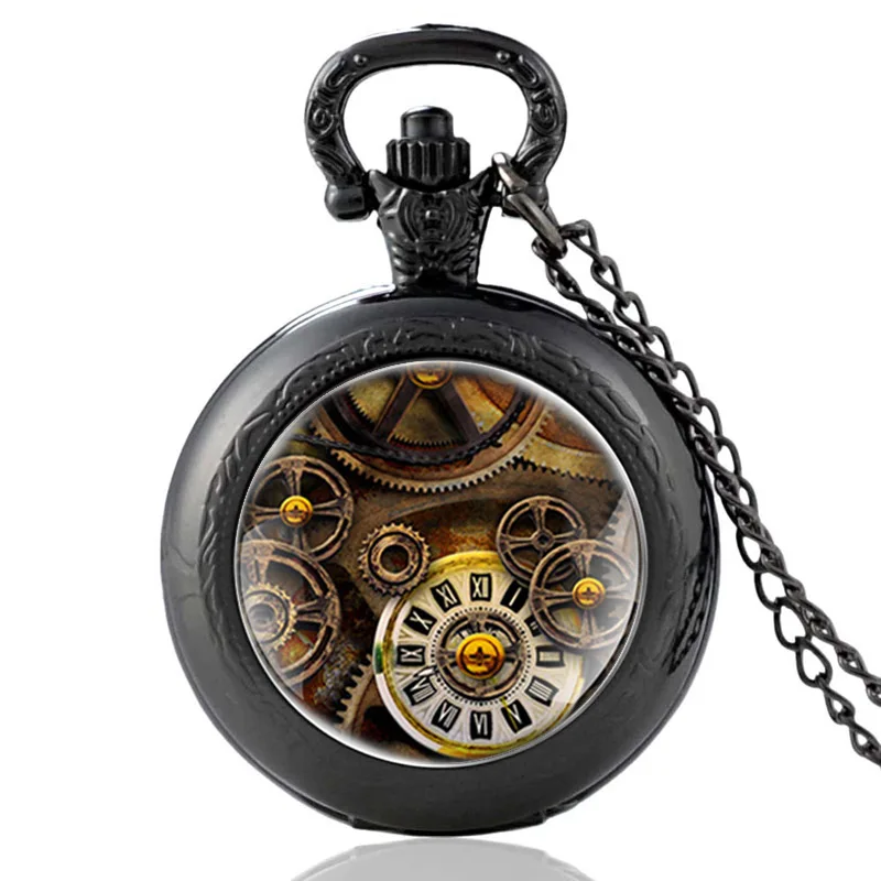 Черные модные кварцевые карманные часы в стиле стимпанк с кабошоном...