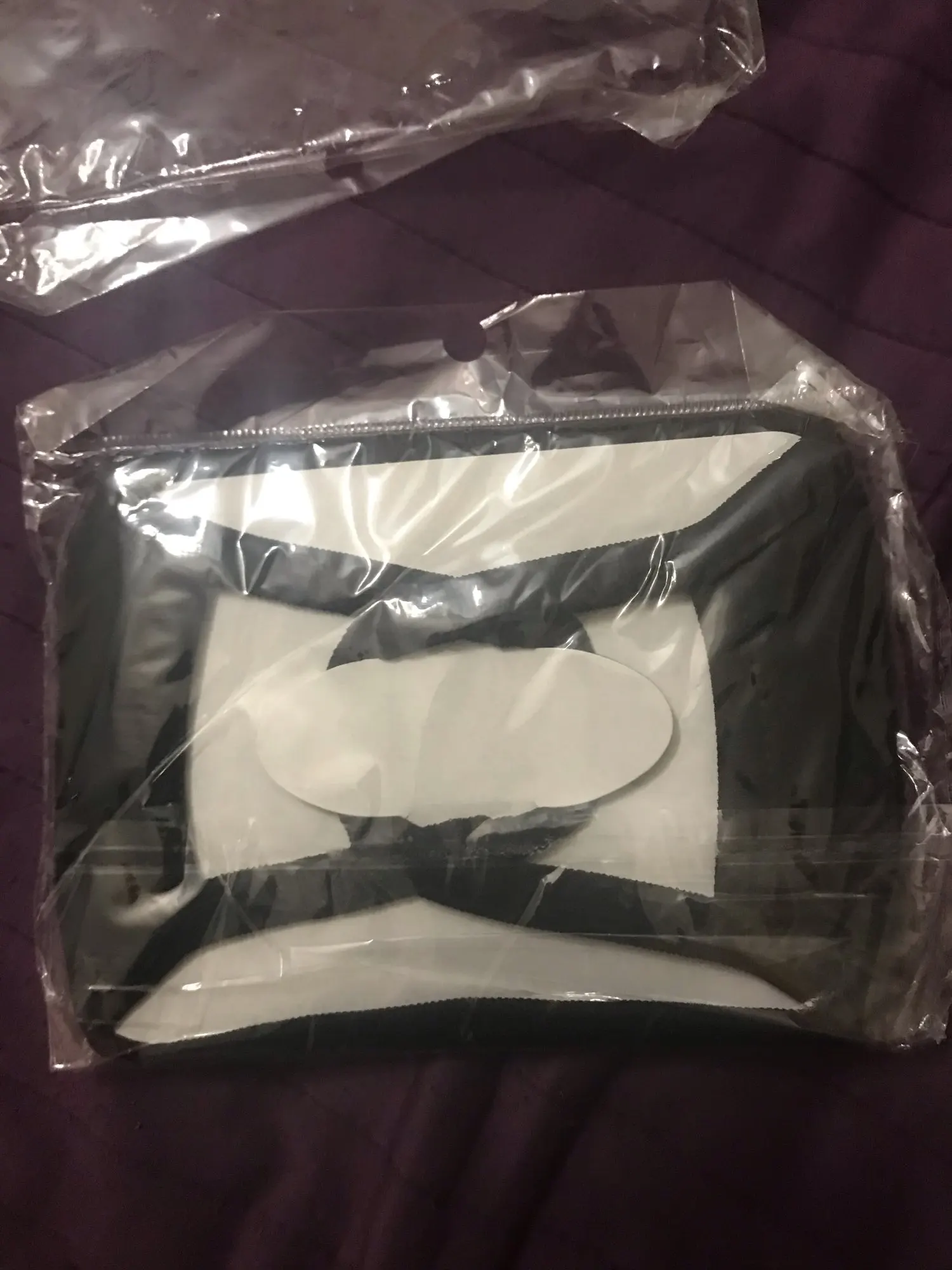 Немного большая маска, приятная на ощупь ткань. Товар перестал отслеживается но все равно пришел. Я довольна