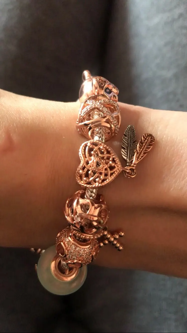 Шармы выглядят просто великолепно! Детализированы и блестят - тут не к чему придраться! Имеют приятный глазу оттенок розового золота, который однако немного отличается от оригинального сплава Pandora rose и по тону розовее. На каждом изделии стоит проба, но без надписи бренда. Рекомендую к покупке.