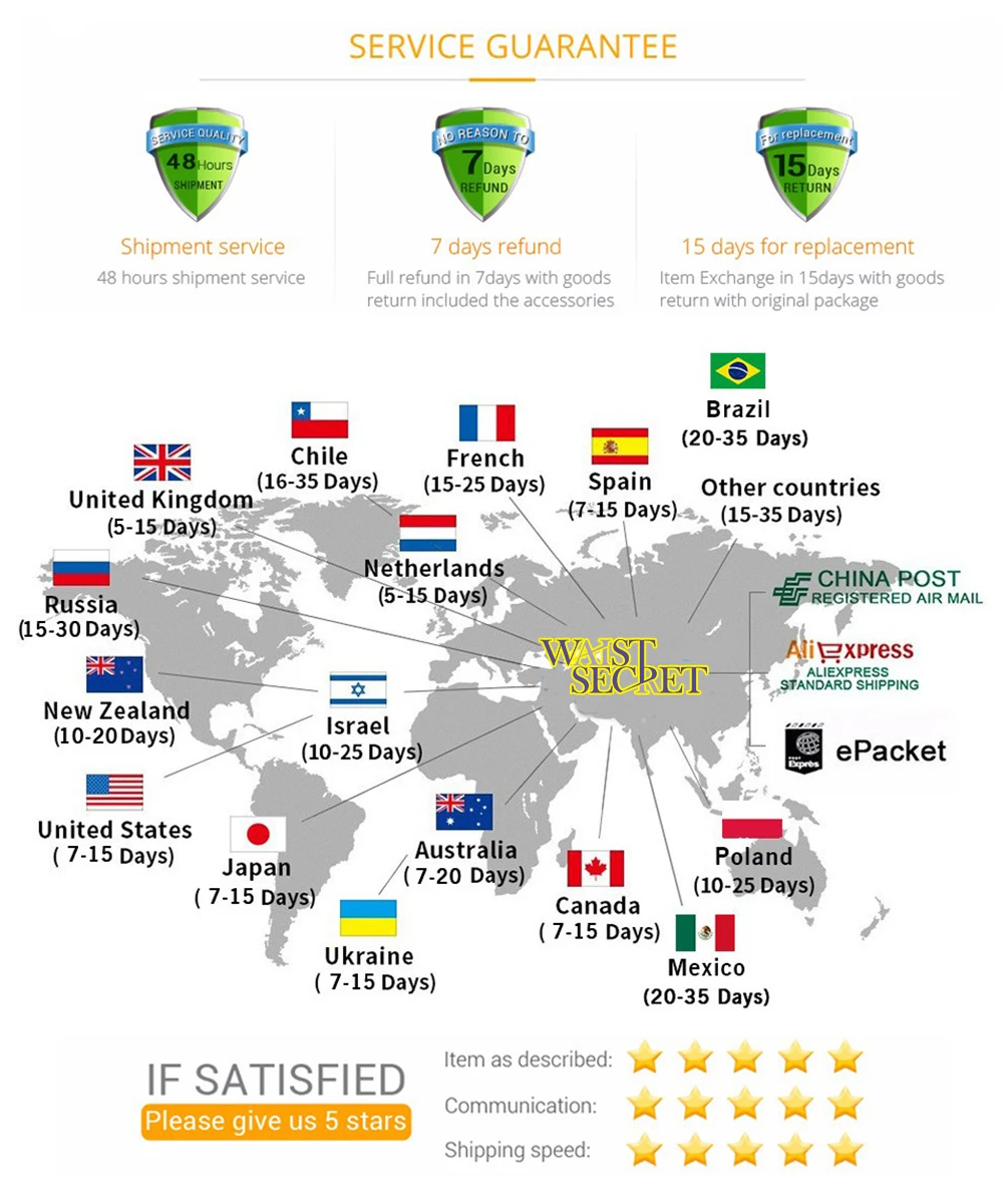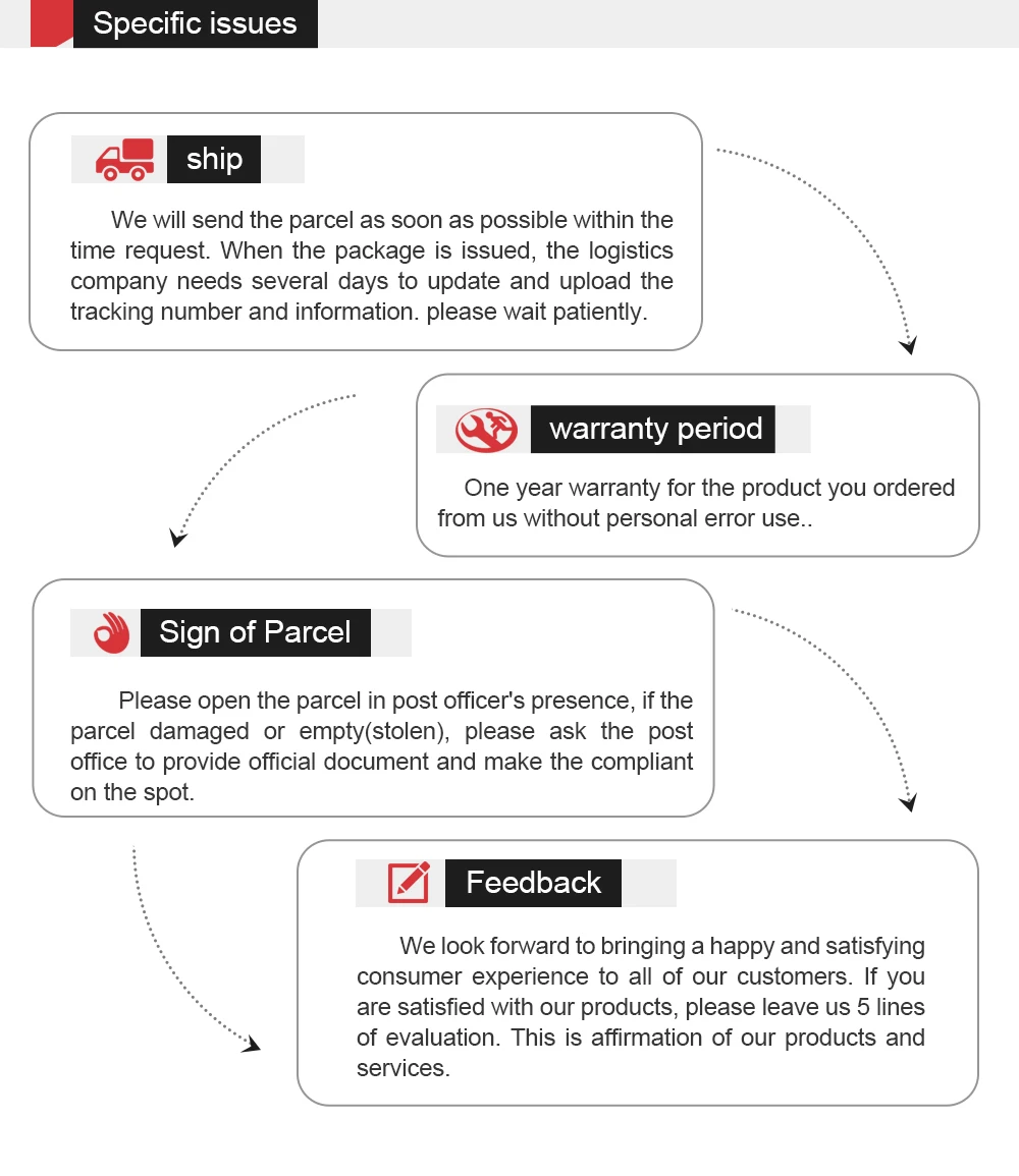 -Возврат: Если есть какие-либо проблемы с качеством, пожалуйста, предоставьте нам подробную информацию в течение 7 дней после получения посылки, мы подтвердим проблему, а затем предложим вам удовлетворительное решение. Все возвращаемые товары должны быть оригинальной посылка, и, пожалуйста, Предложите номер отслеживания. -Отзывы: Мы поддерживаем высокие стандарты качества и стремимся к 100% удовлетворенности клиентов! Отзывы очень важны! Мы просим Вас немедленно связаться с нами, прежде чем дать нам нейтральные или отрицательные отзывы, мы сделаем все возможное, чтобы решить любые проблемы и предоставить Вам лучшее обслуживание клиентов. Мы ценим 5-звездочный положительный отзывы, это хорошо для нашего долгосрочного бизнеса. Мы также отправим вам такие же отзывы.