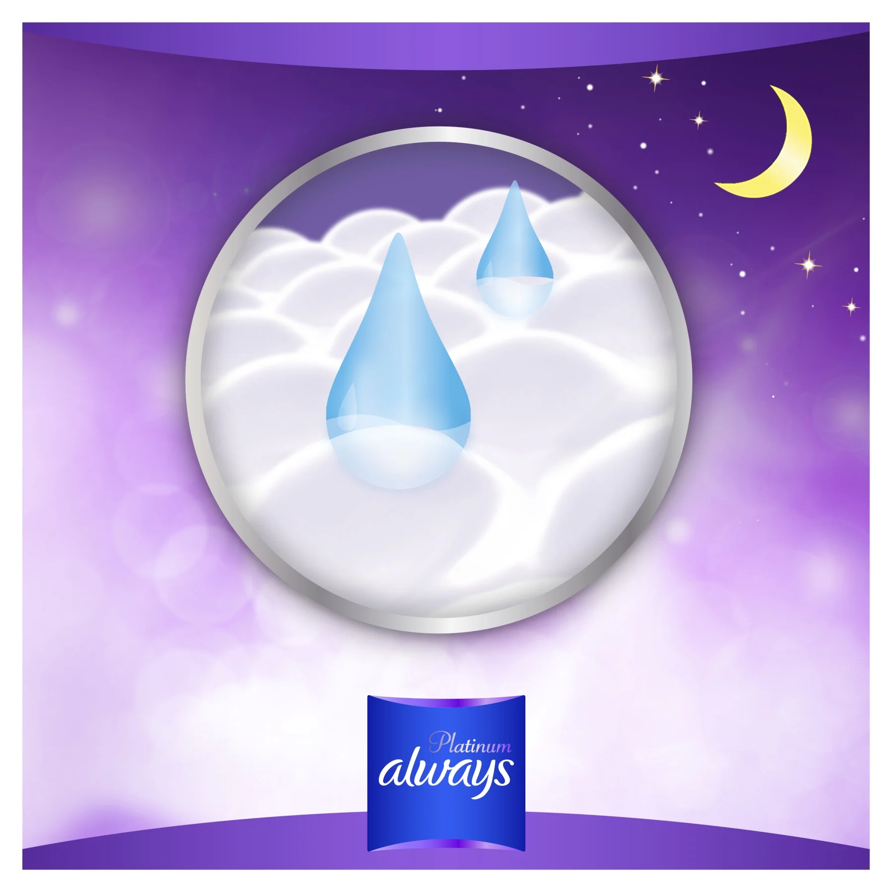 Гигиенические прокладки Always Platinum обеспечивают лучшее сочетание комфорта и защиты среди прокладок Always. Always Platinum более комфортны (по сравнению с Always Ultra) благодаря тысячам микроподушечек и новым, мягким как шелк крылышкам. Они также обеспечивают лучшую защиту (по сравнению с Always Ultra) благодаря защитным боковым барьерам и ультравпитывающему внутреннему слою, который запирает влагу внутри.