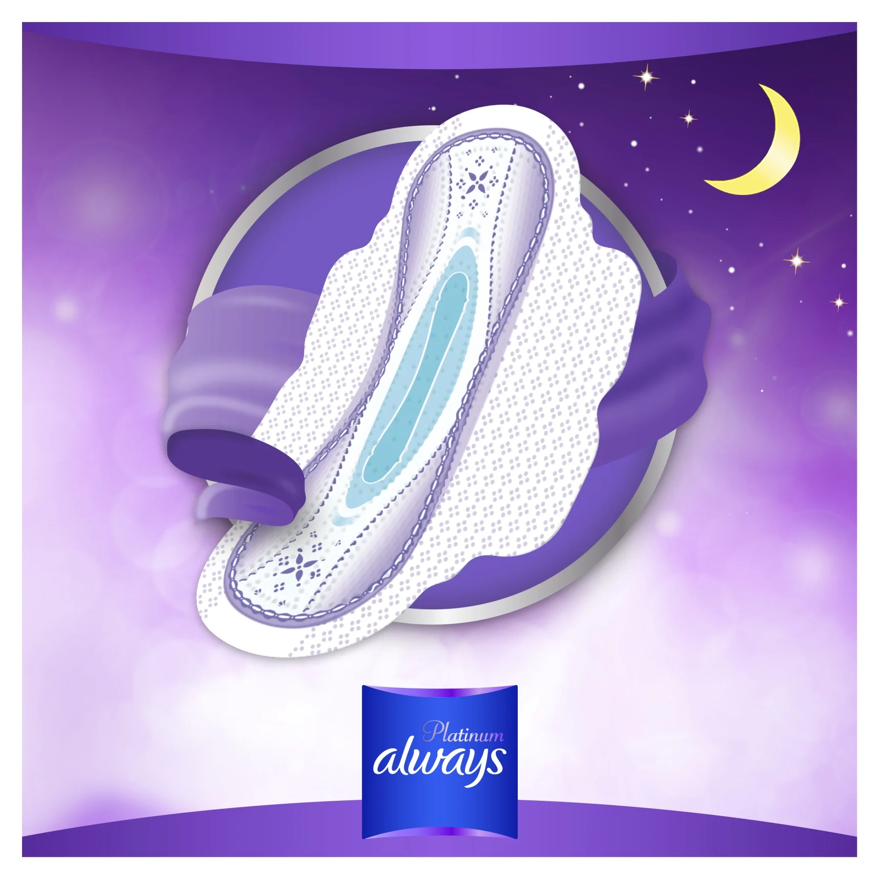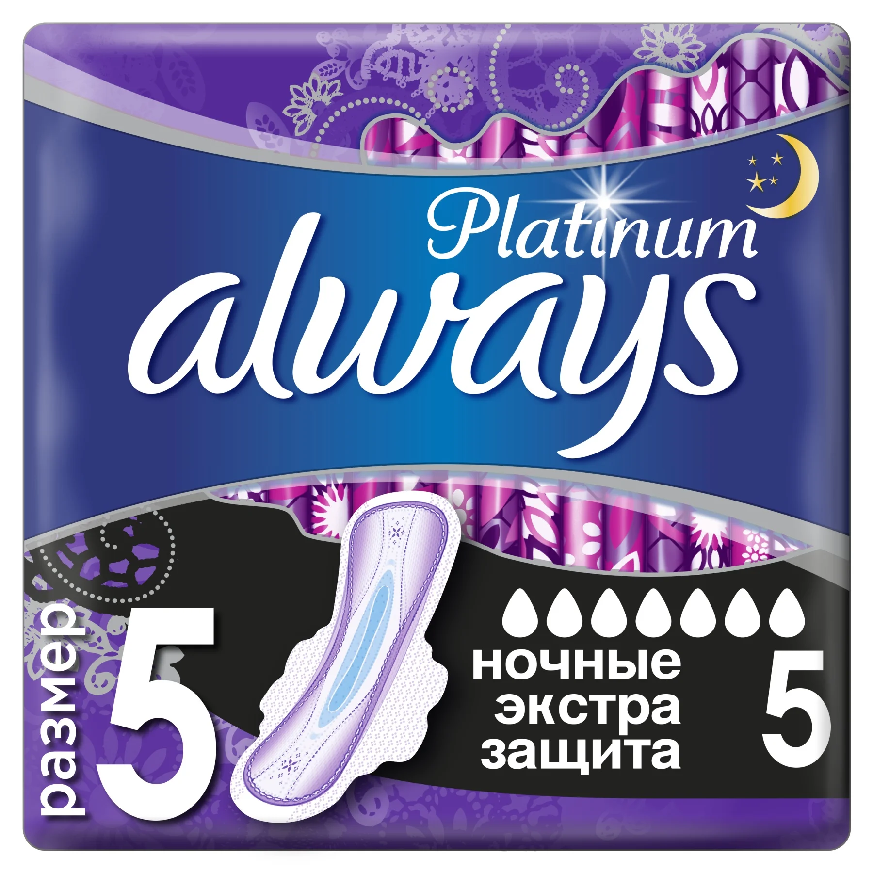 Always Platinum Secure Night (Размер 5) с крылышками рекомендованы для ночного использования, благодаря удлиненной на 60% задней части (по сравнению с Always Platinum Размер 2). Попробуйте Always Platinum Long (Размер 2) для дневного использования при умеренных выделениях.