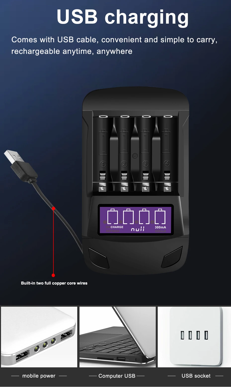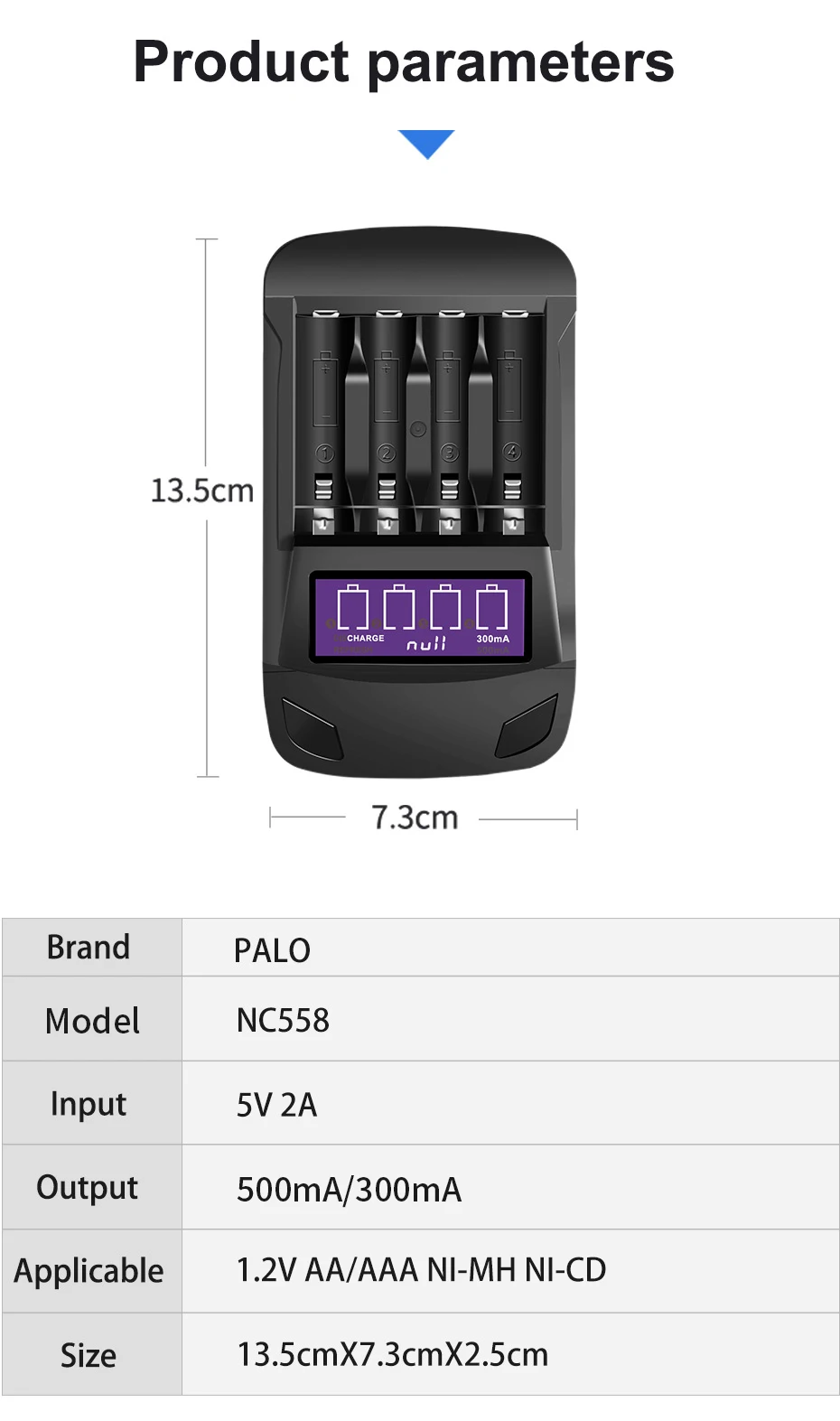 1. Зарядное напряжение и ток: 300mA или 500mA, 1,2 V 500mA * 4 или 1,2 V 300mA * 4. 2. Разрядное напряжение и ток: 300mA или 500mA, критическое разрядное напряжение 0,9 V. 3. Тип аккумулятора: для 1,2 V AA, AAA, никель-металл-гидридного или гидридных и никель-кадмиевых типов аккумуляторов многоразовых перезаряжающихся батарей, обеспечивает не используйте устройство для зарядки литиевой батареи или одноразовый аккумулятор. 4. Кнопка режима: Переключайте режим работы зарядного устройства, по умолчанию используется режим зарядки, нажмите и удерживайте кнопку 2 секунды, чтобы переключиться на режим разрядки или режим обновления. 5. Кнопка тока: Нажмите и удерживайте кнопку 2 секунды, чтобы переключить ток заряда или постоянный ток на 300 мА или 500 мА. 6. После ввода зарядки нажмите кнопку MODE, чтобы просмотреть напряжение каждого аккумулятора. 7. Умный чип может разумно определить плохой аккумулятор или не перезаряжаемый аккумулятор и подсказать пользователю. 8. Зарядное устройство поставляется с usb-кабелем для зарядки, материал-медный сердечник, не будет высокой температуры при использовании большого заряда тока, небольшие потери зарядки. 9. Зарядка через USB, с интерфейсом Micro-USB и Type C, по всему миру, для любой страны. 10. Материал зарядного устройства сам по себе является огнестойким сырьем, теплом и высокой температурой, максимальной температурной защитой 65 °C. 11. ЖК-смарт-зарядное устройство Модернизированная версия, батарея легко выбрать и разместить, может переключаться с высокой текущей зарядки или разряда, напоминает форму спортивного автомобиля, хороший выбор для подарка. Функция ключ: 1. Модель "CHARGE": функция зарядки аккумулятора, модель импульсной зарядки. 2. "Слива" Модель: батарея разряжена, устраняют питание от аккумулятора, батарейку рядом до 0,9 V, чтобы остановить разрядки. 3. "Обновленная" Модель: Испытание на цикл батареи, зарядка-разрядка-зарядка, цикл один раз, обновление напряжения батареи. 4. Оповещение об ошибке: положительные и отрицательные полюсы слота батареи коротки или вставляются неперезаряжаемые батареи, будут отображаться «ошибки».