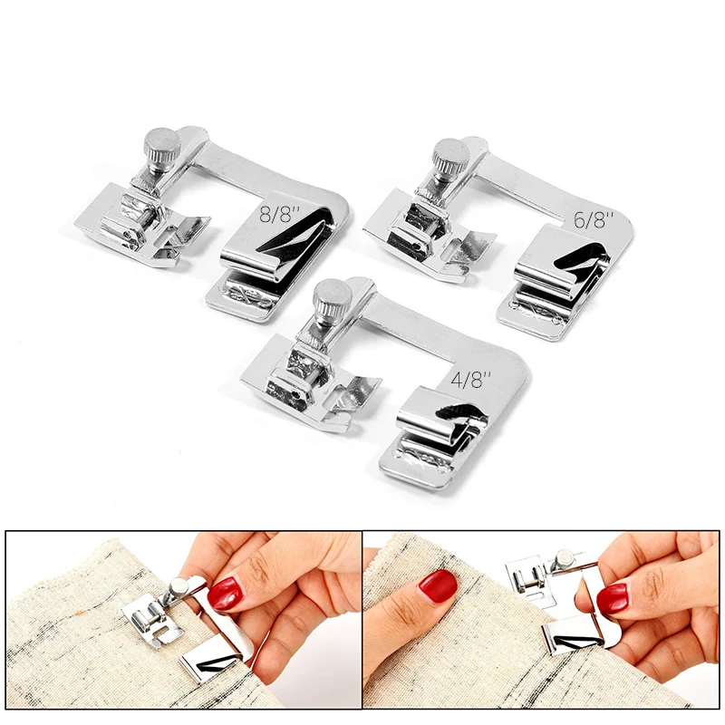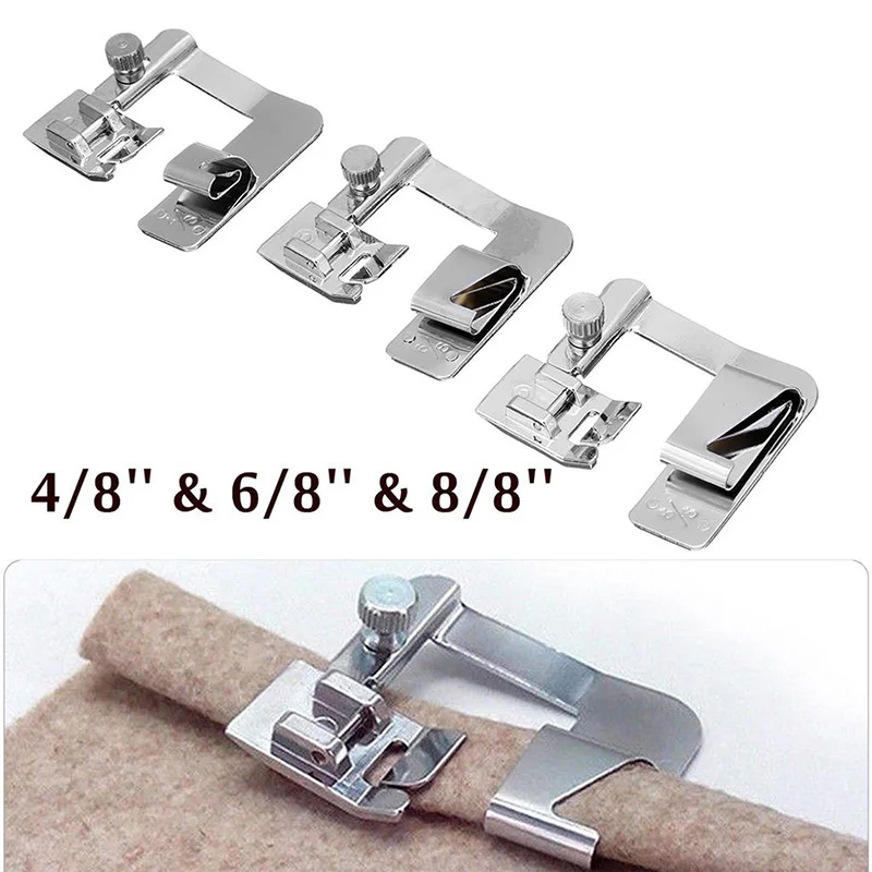3. Универсальный свернутый подол ПРИЖИМНОЙ НОГИ в 3 размерах: 4/8, 6/8, 8/8 для полного удовлетворения ваших потребностей домашнего применения, широко используется в одежде и других проектах с легкой тканью.