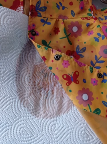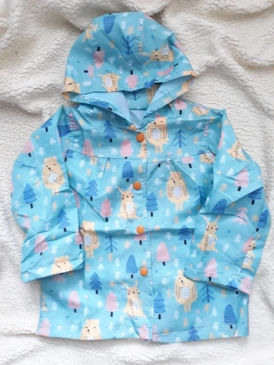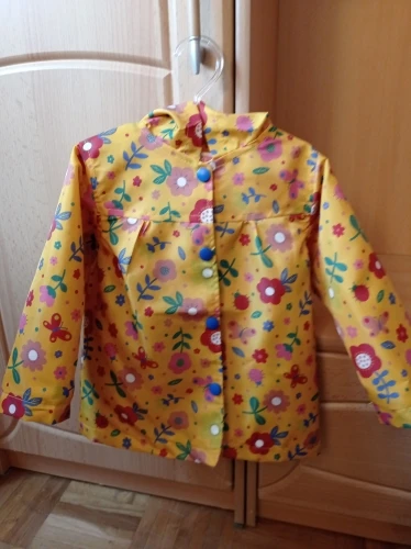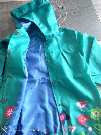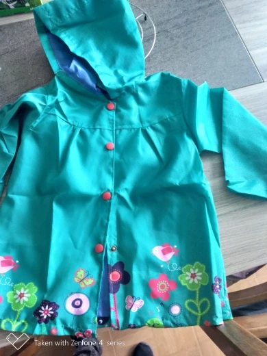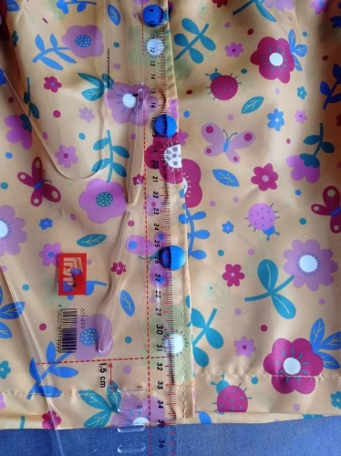 На рост 81-83см и 10кг (15 месяцев) сидит хорошо, в рукавах запас, "пухлый низ" прикрыт, куртка не висит ниже колен как мешок. Большие кнопки, куртку можно погладить, есть подкладка. Только это не дождевик, а скорее ветровка, жаль