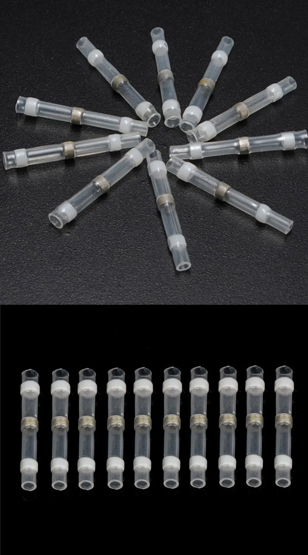 10/20/50 шт. термоусадочные стыковые клеммы, водонепроницаемое паяльное уплотнение Описание:100% Новинка и высокое качество-Легкое одношаговое соединение проводов, припаянных, изолированных и герметичных-Может быть идеальным использованием в морских и автомобильных применениях-Полиолефиновые трубки снаружи и термоплавкий клей внутри-Припой и уплотнение и с усовершенствованной водонепроницаемой функцией-Полиолефиновые термоусадочные стыковые соединители улучшенной прочности на выдвижной отверстие, обеспечивают уплотнение, снятие натяжения, проверку кабеля и изоляцию