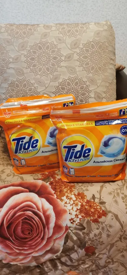 Tide ВСЁ в 1 Альпийская Cвежесть — это потрясающая эффективность всего в одной капсуле. Кристальная чистота и никаких следов. Попробуйте инновационное средство для стирки от Tide — Tide ВСЁ в 1 PODS. Каждая капсула состоит из 3 секций — таким образом, ее ингредиенты не смешиваются до начала стирки. При контакте с водой специальная инновационная пленка растворяется, и капсула начинает свое действие: очищает, удаляет пятна, придает яркость и освежает; она эффективна уже при 20 °С. Одной капсулы хватает, чтобы полностью выстирать полный барабан грязных вещей. Tide ВСЁ в 1 PODS — это надежный выбор для удивительно эффективной стирки. Используйте вместе с кондиционерами Lenor, которые придают белью еще больше мягкости и свежести.