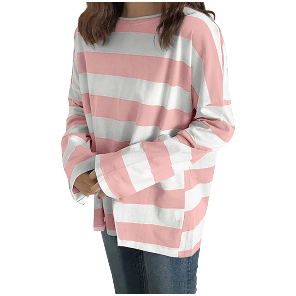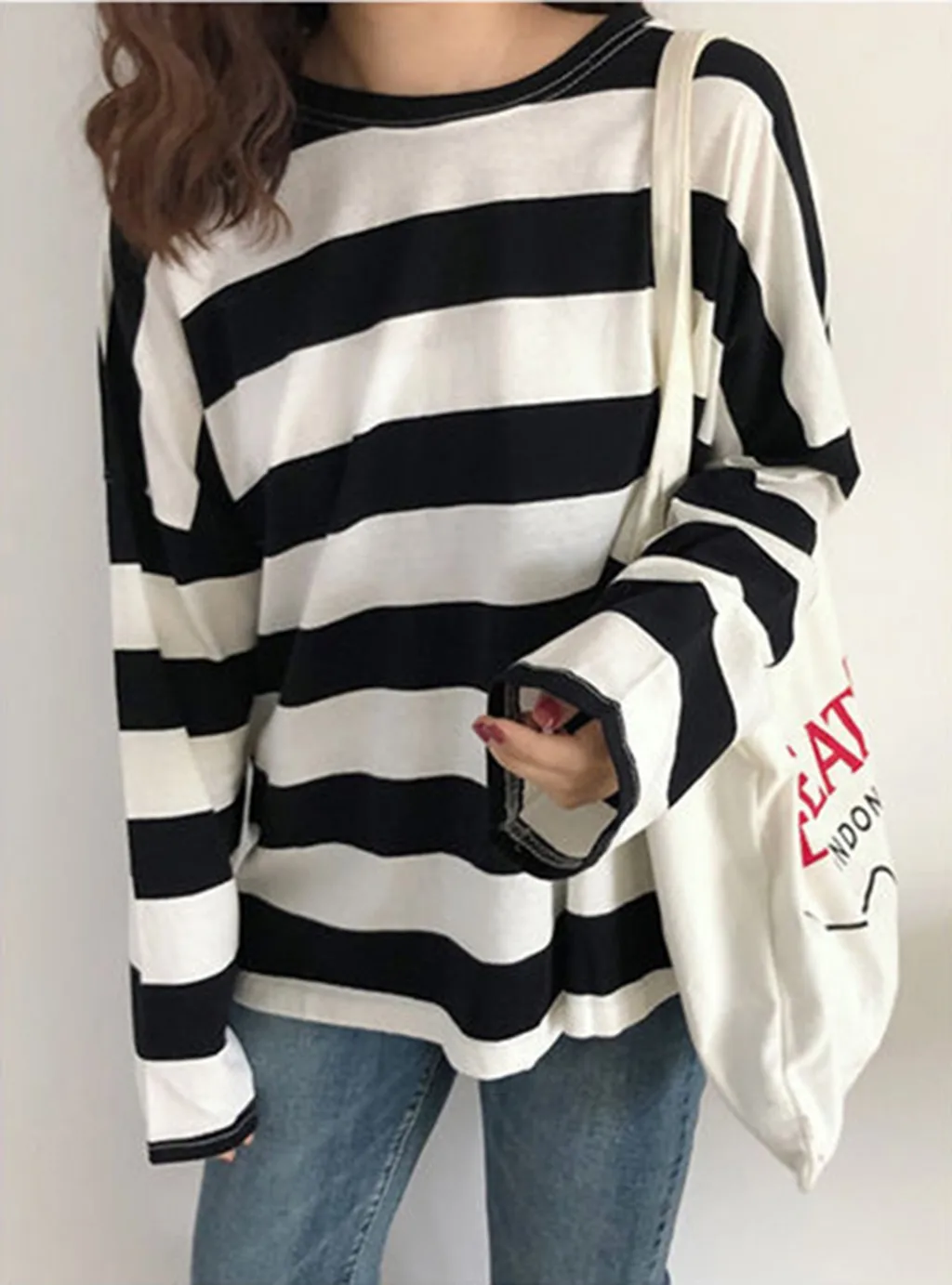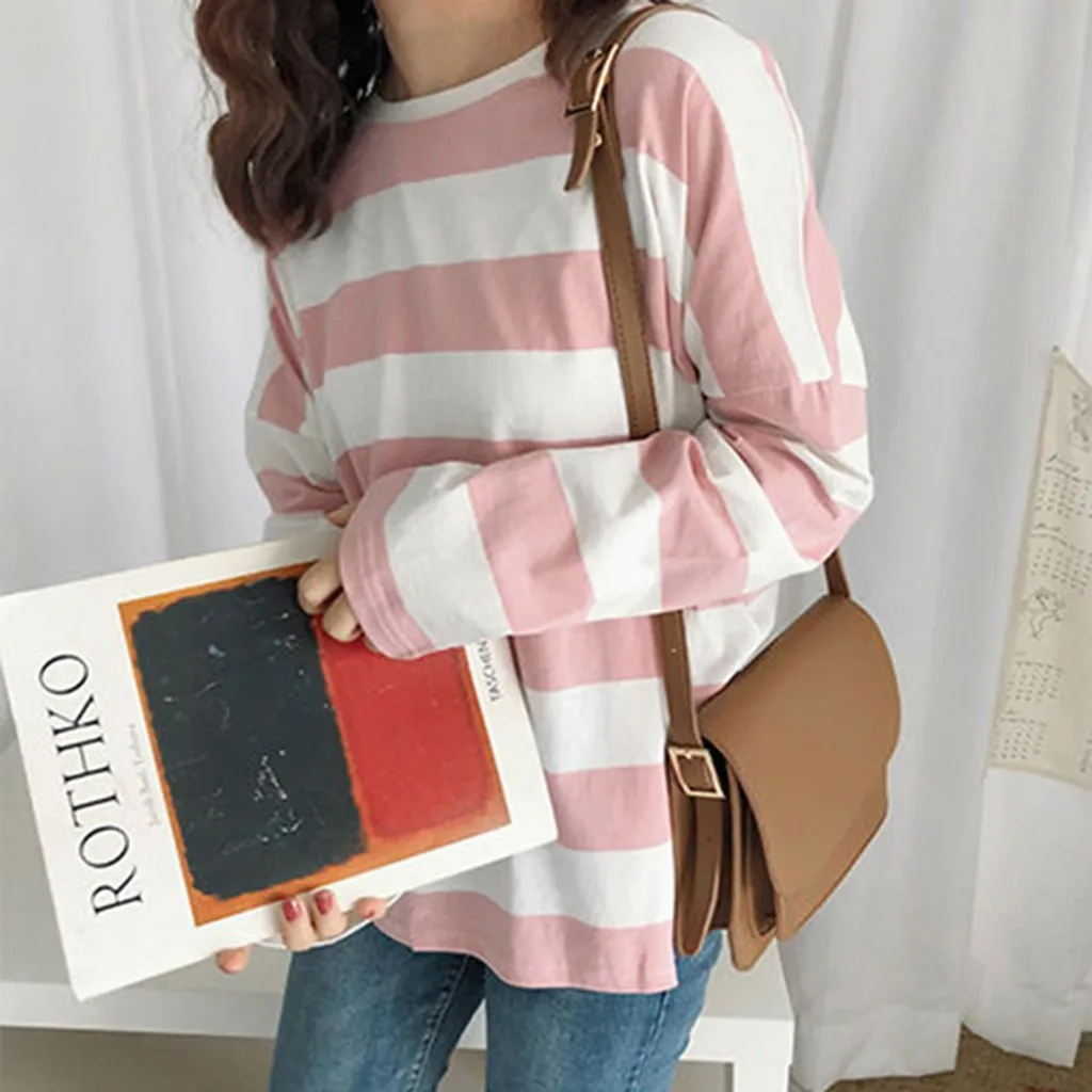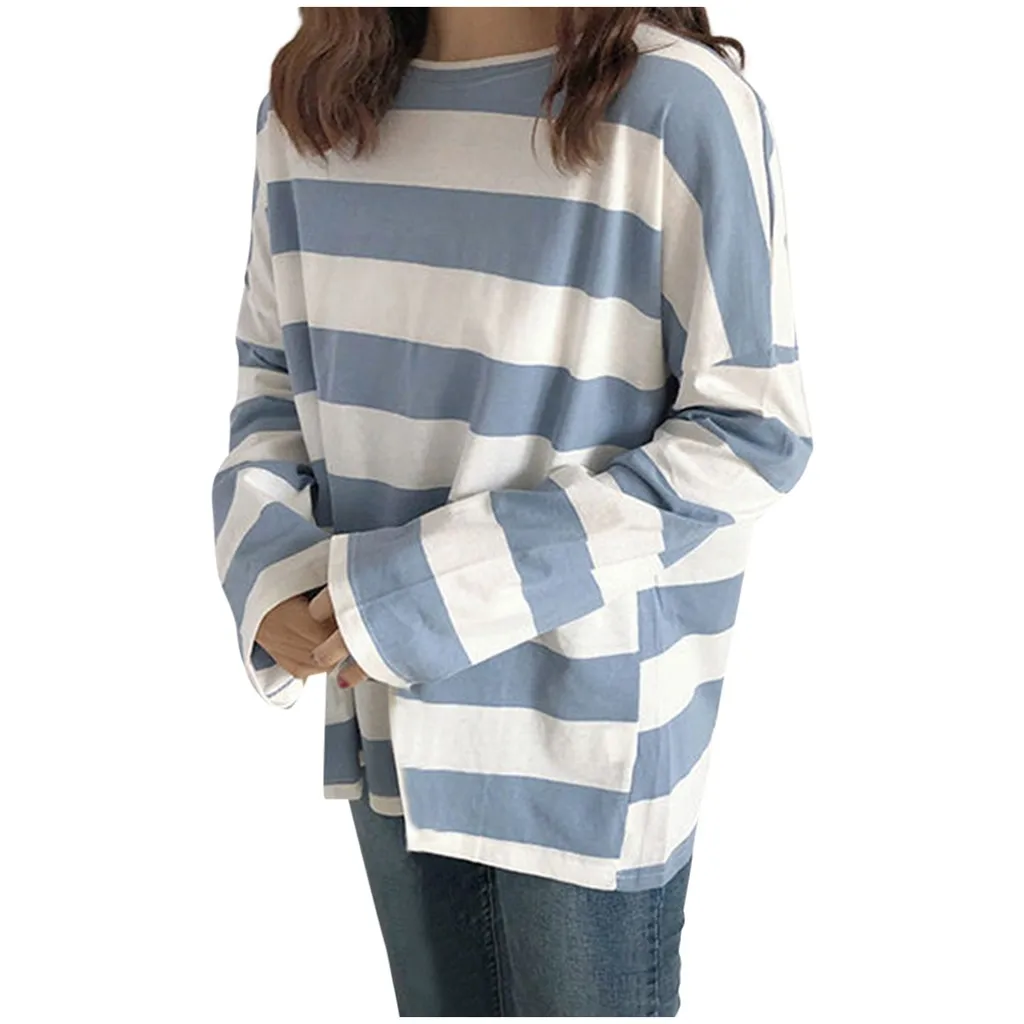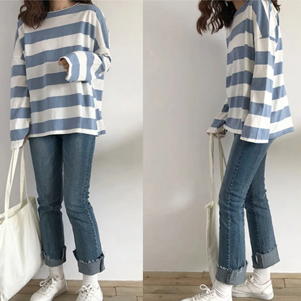 Женская Полосатая футболка с длинным рукавом для девочек, тканевый Топ, повседневная одежда