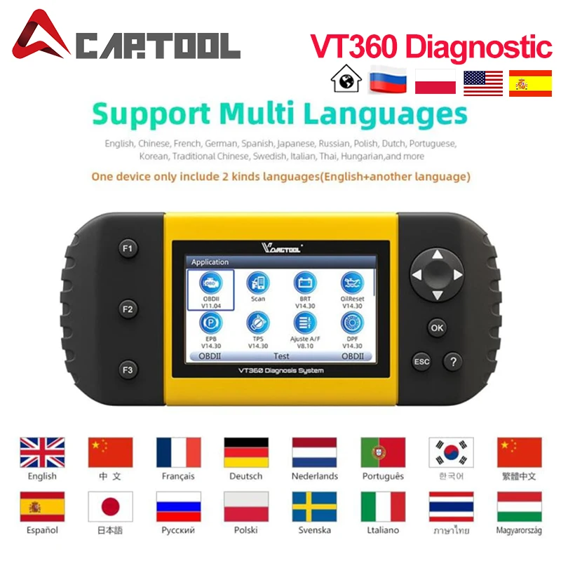 Автомобильный диагностический инструмент VT360 поддерживает 16 языков, вы можете выбрать английский + другой язык в одном VT360
