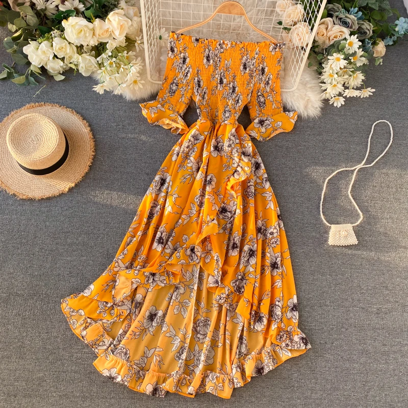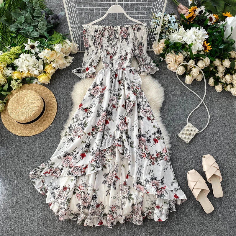 Женское платье в пляжном стиле, с открытыми плечами и высокой талией, Асимметричный Сарафан с оборками, для отдыха у моря