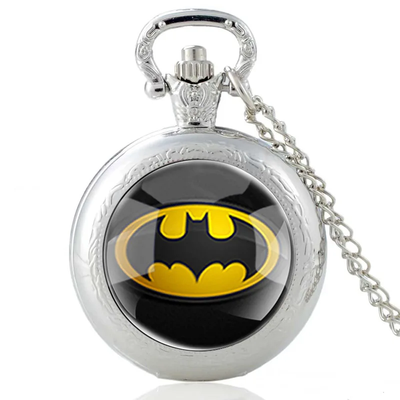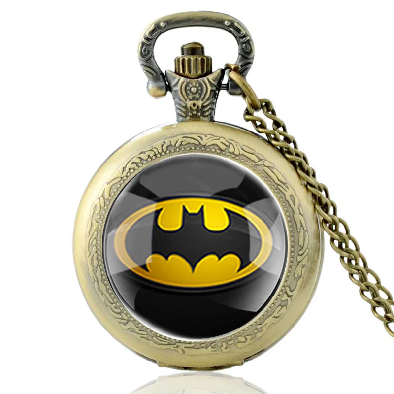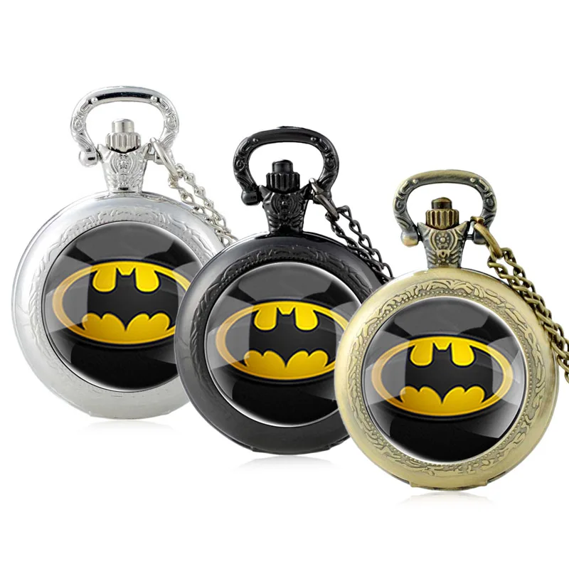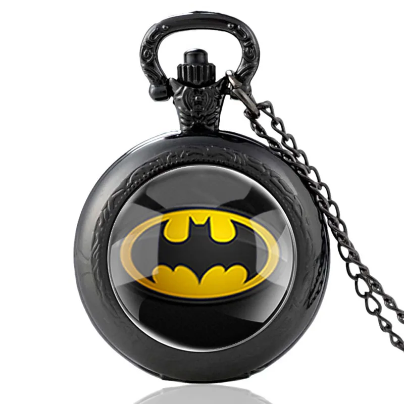 Классические черные кварцевые карманные часы со стеклянным кабошоном и символом летучая мышь, винтажные мужские и женские часы с подвеской и цепочкой, подарки