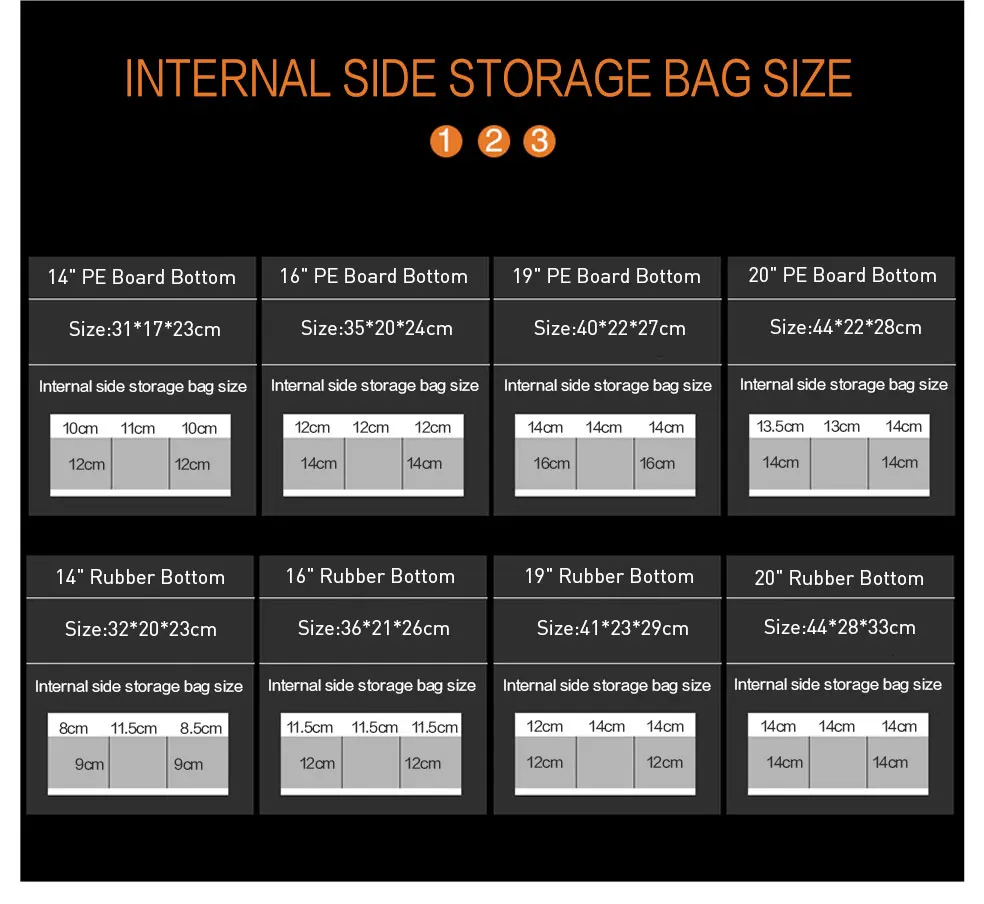 Сумка 18дюймов, по факту меньше, чем рассчитывал, наружные карманы не функциональные (плотно прилегают к сумке, ничего объёмного не положить).