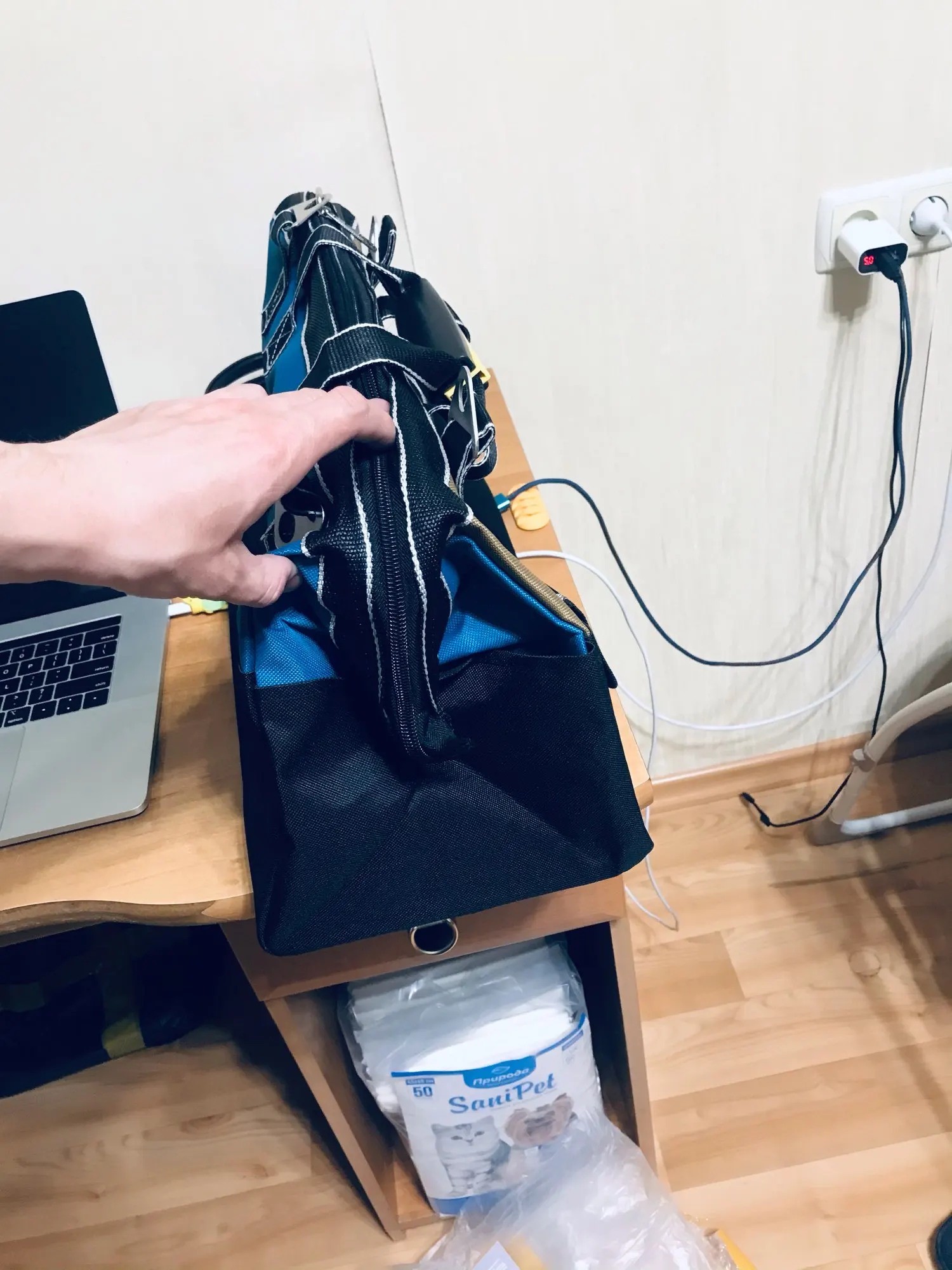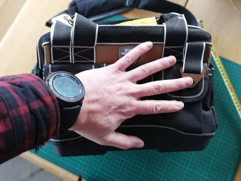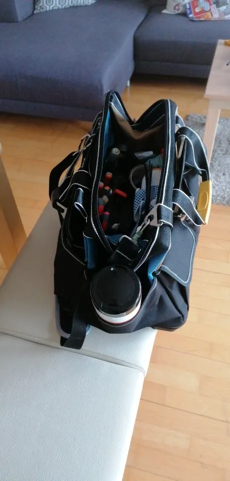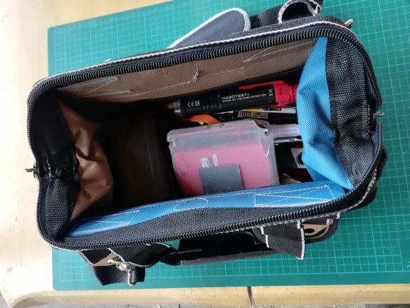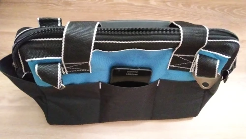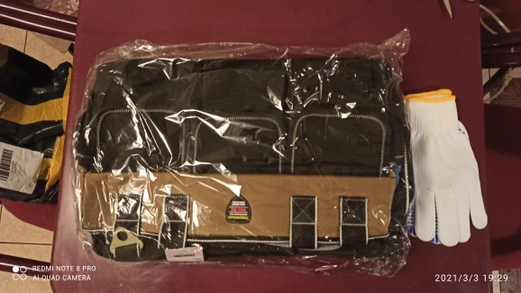 заказывал из России, приехала за два дня! отличная сумка для инструмента. сшита аккуратно, нитки нигде не торчат. есть вшитые ребра жёсткости. очень доволен, разве что карманы очень тугие, могли бы быть посвободнее