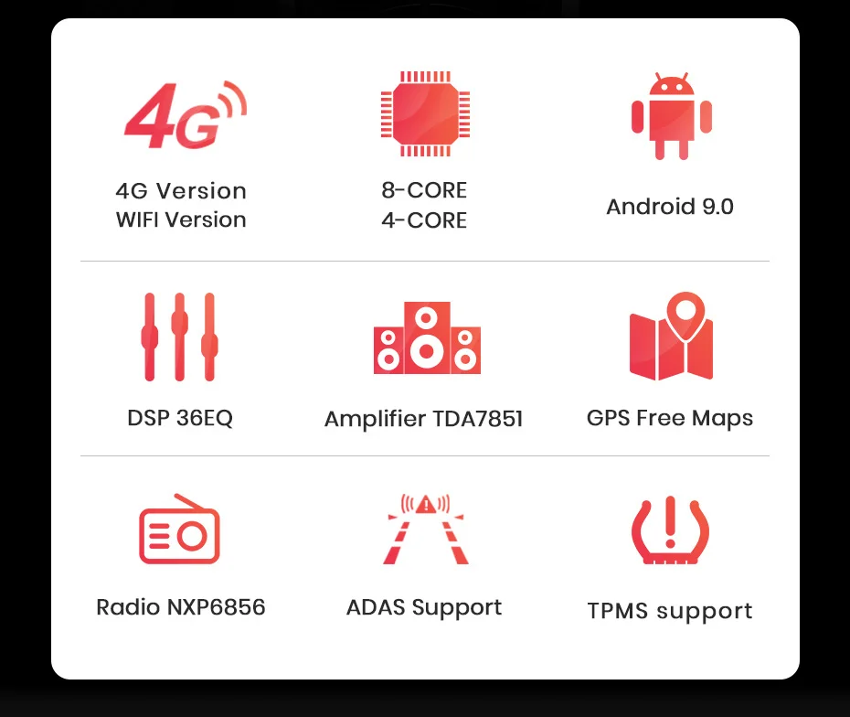 > 9 дюймов 2.5D емкостный Экран + 4 ядра 1,2 ГГц Процессор + DDR3 1 ГБ/2 ГБ/4 ГБ флэш-памяти (опционально) + 16 Гб/32 ГБ/64 Гб памяти (опционально) + встроенный Wifi (4G сеть опционально) + gps-навигация (Бесплатное обновление карты) + управление рулевым колесом + зеркальная связь + Bluetooth + Встроенный микрофон + FM/AM + RDS + Поддержка USB DVR ADAS + Поддержка Европейской DAB функции + 1080P видео воспроизведение + HD 1024*600 + Поддержка контроля давления в шинах Системы> OSD языкРусский, английский, испанский, итальянский, французский, немецкий, китайский, эстонский, польский, филиппинский, финский, корейский, голландский, хорватский, латышский, литовский, румынский, норвежский, португальский, японский, шведский, тайский, турецкий, украинский, венгерский. > 7*24 часов обслуживанияВ Awesafe наша миссия упорно работает, чтобы предоставить вам надежный и замечательный Автомобильный мультимедийный плеер/автомобильное радио, инновационное оборудование и программное обеспечение, а также бесплатные обновления для прошивки, программного обеспечения, GPS навигационные карты.