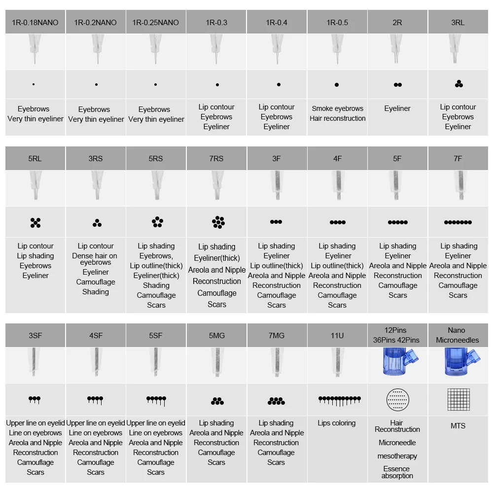 Вопрос и ответы:1. Какая машина может использовать эти иглы?Подходит для BMX брендовой машины, которые продаются в нашем магазине. P300/HP-100/CQ003/LW002. ..2. Какой диаметр игл?1R--0.16 мм1R--0.18 мм1R--0.2 мм1R--0.25 мм1R--0.30 мм1R--0.40 мм1R--0.50 мм2R--0.40 мм3/5/7/RL--0.25 мм3/5/7RS--0.25 мм3/4/5SF--0.25 мм5/7MG--0.25 мм12P--0.25 мм3. Какую модель мне выбрать?1R: круглая игла, подходит для тонкой подводки, бровей (самый популярный размер)2R 3RL: для подводки глаз3RL 5RL 7RL: толстый лайнер, для тумана бровей, тени для губRS: шейдеры, бровиF /M1: для окрашивания губ12P:MTS4. Сколько времени займет доставка?Обычно занимает 2-5 недель. Для России, быстрая скорость составляет 10 дней!