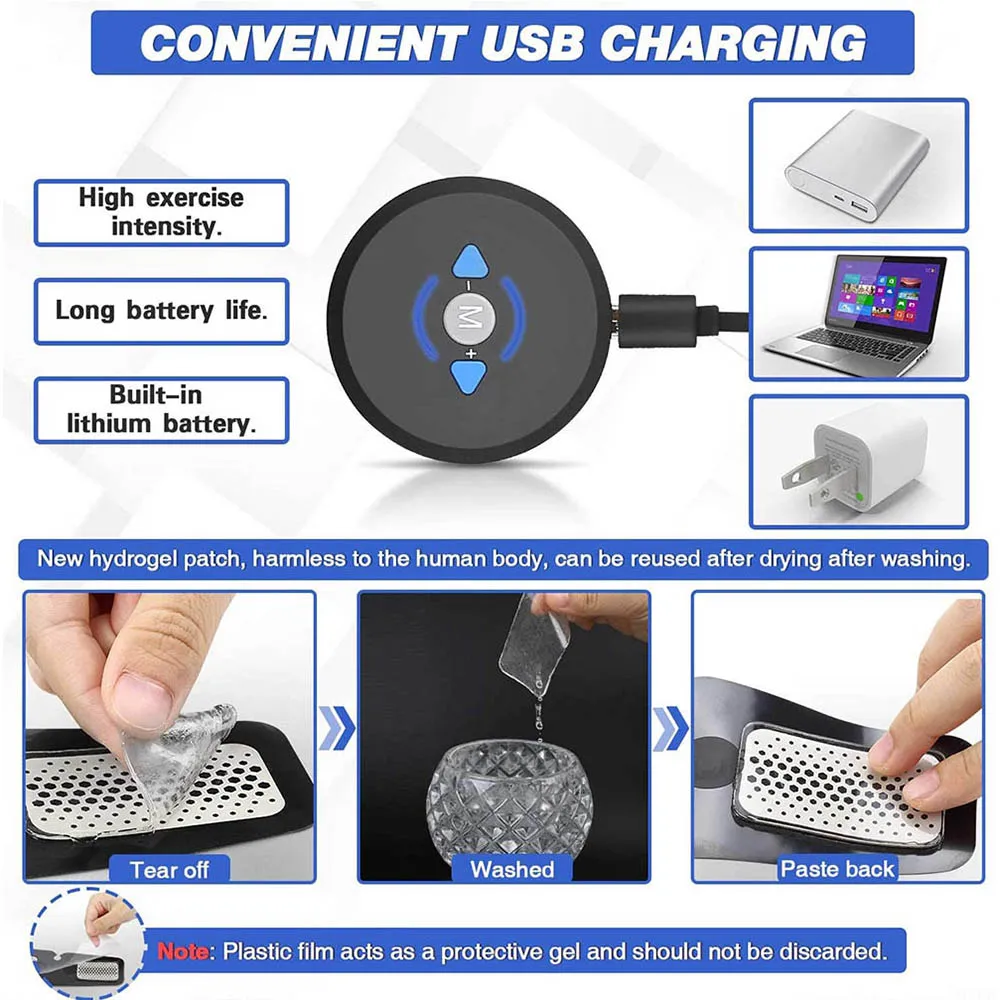 √ 【Черный и синий дизайн в форме пояса-больше покрытия для мышц-EMS стимулятор мышц разработан как пояс, который адаптируется к изгибам тела и обеспечивает больше покрытия подушечками для мышц. Идеально подходит для ваших рук, груди, верхней и нижней части живота, спины, ног, ягодиц, бедер, икр и талии.√ 【Usb-зарядка: Экономичная и экологически безопасная-встроенный литиевый аккумулятор и usb-кабель в комплекте, который может не только сэкономить частые затраты на замену батареи, но и защитить окружающую среду. Интенсивность упражнений машины увеличивается на 50% по сравнению с продуктами, работающими от батареи. Вы можете зарядить этот мышечный Стимулятор с помощью ноутбука или внешнего аккумулятора в любое время и в любом месте.√ 【 6 режимов и 9 уровней интенсивности-этот EMS тренажер abs включает в себя 6 режимов и 9 уровней интенсивности, подходит для всех типов спортсменов, которые ценят различные уровни интенсивности упражнений. 6 режимов и 9 уровней интенсивности, от разогрева до интенсивных упражнений и, наконец, до расслабления: сжигание жира, расслабление и упражнения. Вы можете управлять режимом и уровнем, как вы хотите, с помощью 3 кнопок на машине. Кнопка «M» может менять режимы√ 【 Технология EMS и эффективное Домашнее обучение device】 - EMS (электрическая стимуляция мышц) Технология предназначена для обучения ваших мышц применению низких частот непосредственно к мышечным клеткам или клеткам ожирения, которая поможет вам получить легкую и высокопроизводительную тренировку. Вы можете тренироваться и тренироваться с помощью этого EMS тренажера abs, не выходя в тренажерный зал. 20 минут в день, эквивалент 2000 м бега√ 【Гелевые подушечки с сильной адгезией: легко и практично-мы использовали более толстый силикагель, чтобы гарантировать, что гелевая Подушка будет крепко прилипать к вашему телу. Светильник, беспроводной, съемный и мягкий на коже. Вы можете свободно использовать его дома, на работе или во время путешествий, и вы можете наслаждаться упражнениями в любое время и в любом месте, даже если вы смотрите телевизор, вы можете заниматься спортом. Гелевые накладки заменяются