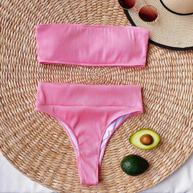 Соблазнительный комплект бикини в рубчик без бретелек с высокой тал...