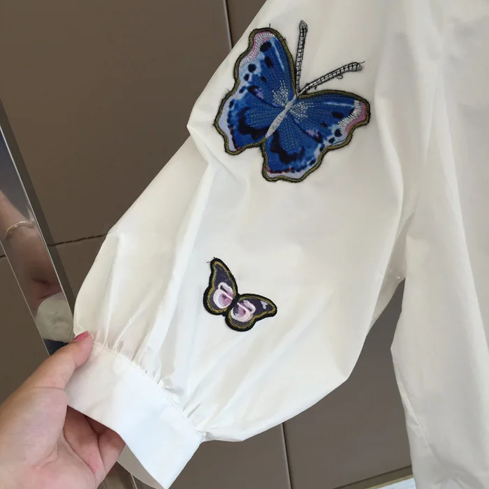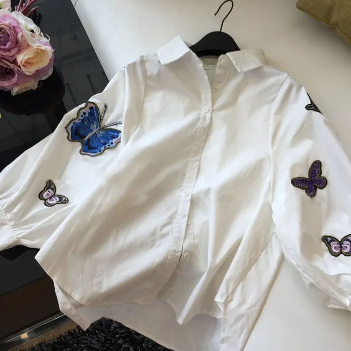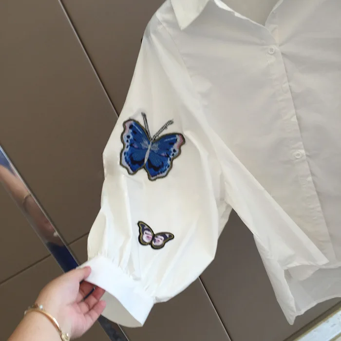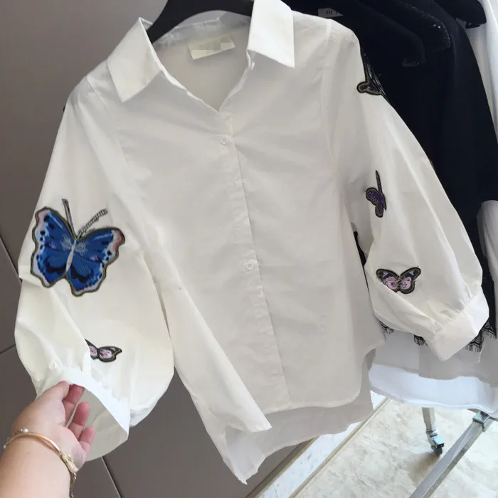 Новинка 2020, белая женская рубашка с вышивкой бабочки, рукав три четверти, свободная блузка и топ, женские рубашки на пуговицах NS4551