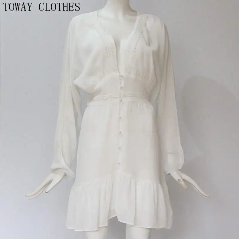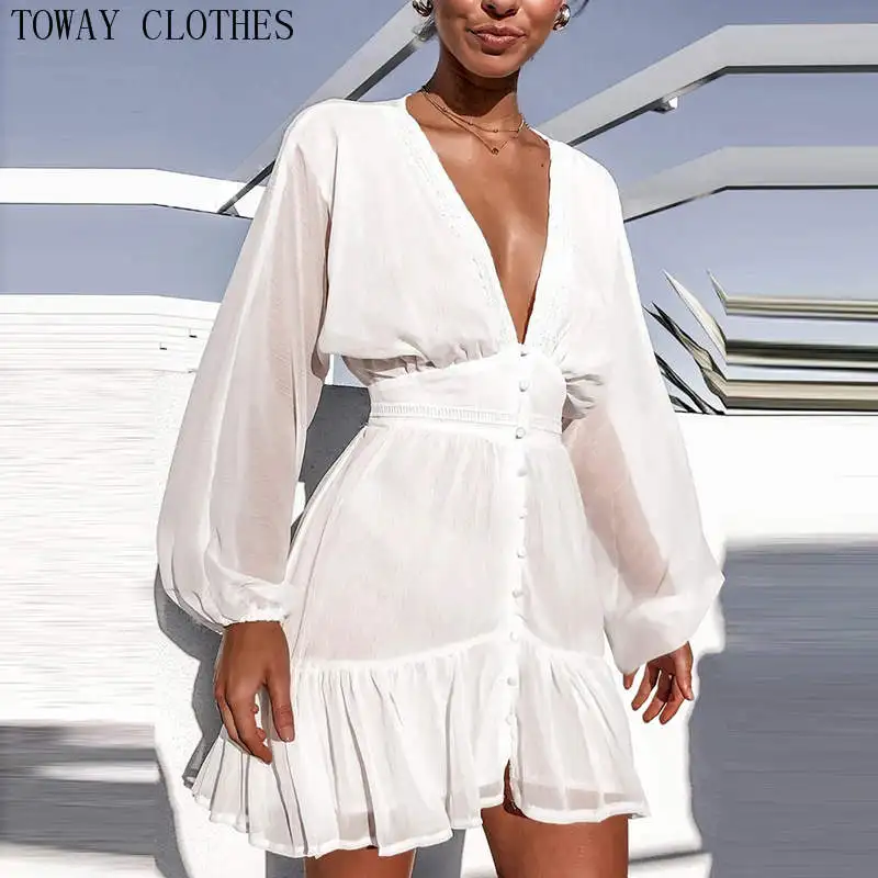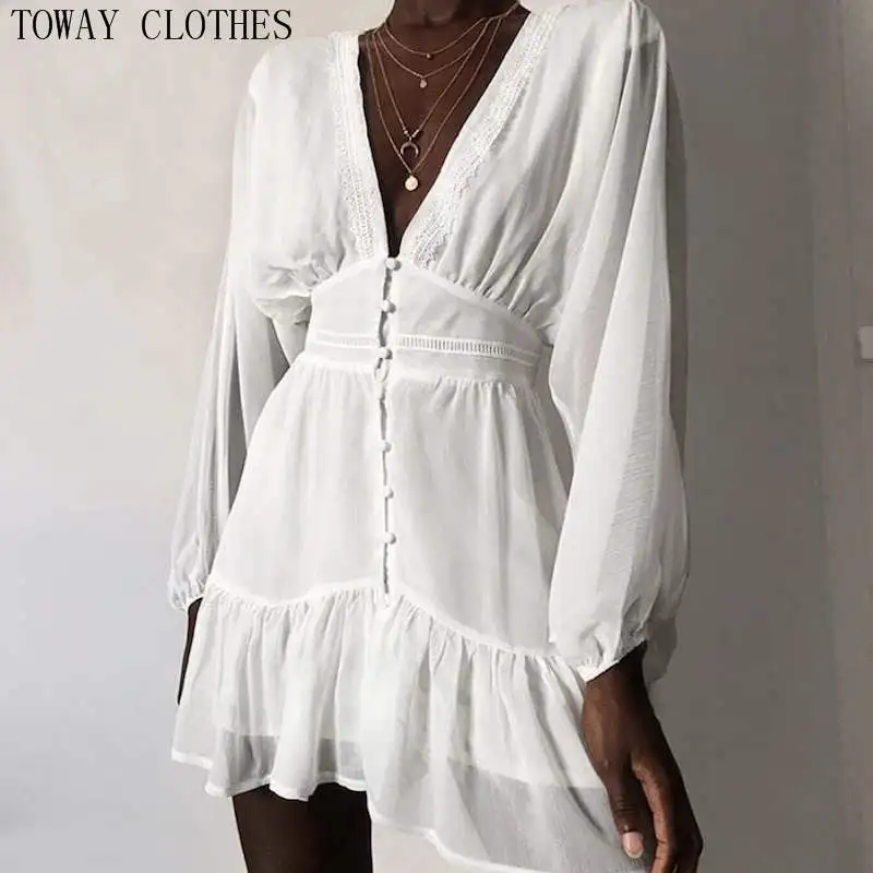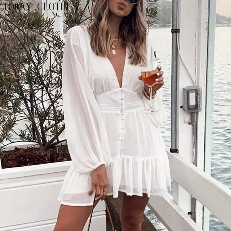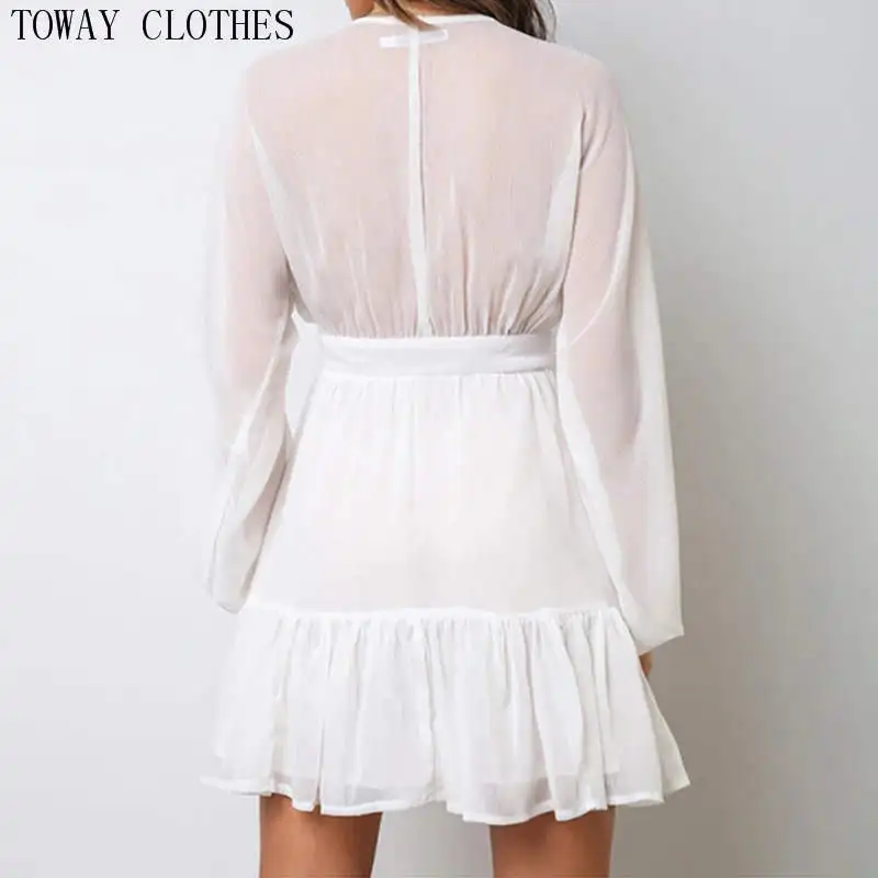 Женское платье с V-образным вырезом, длинным рукавом и оборками