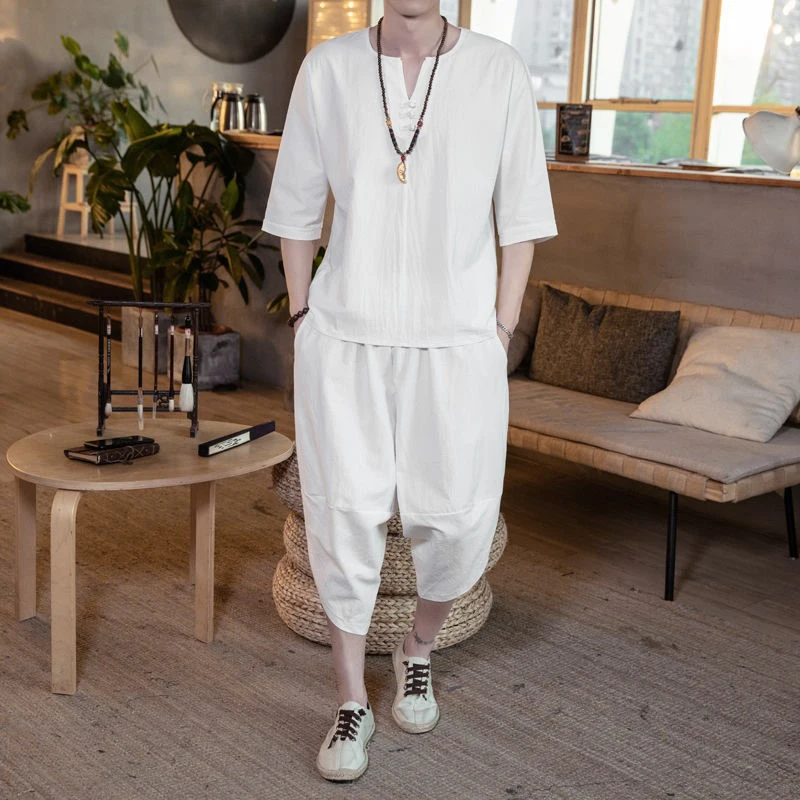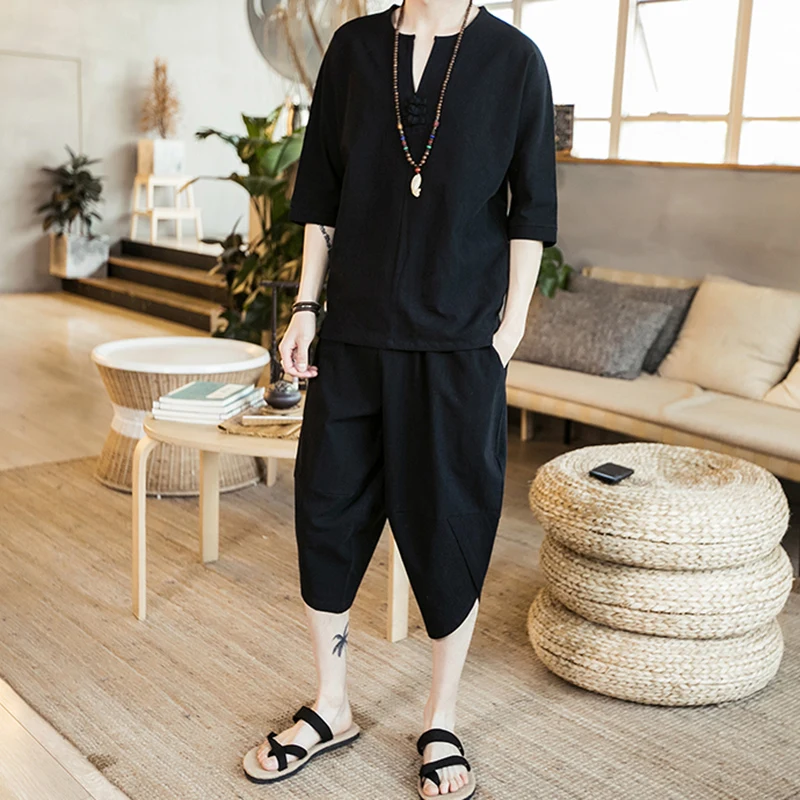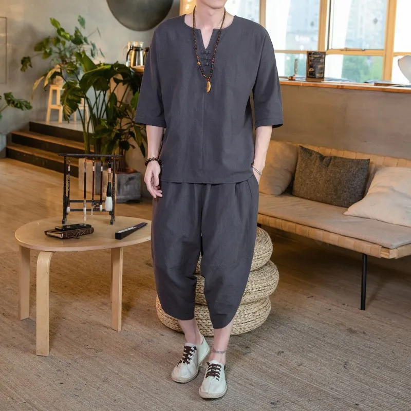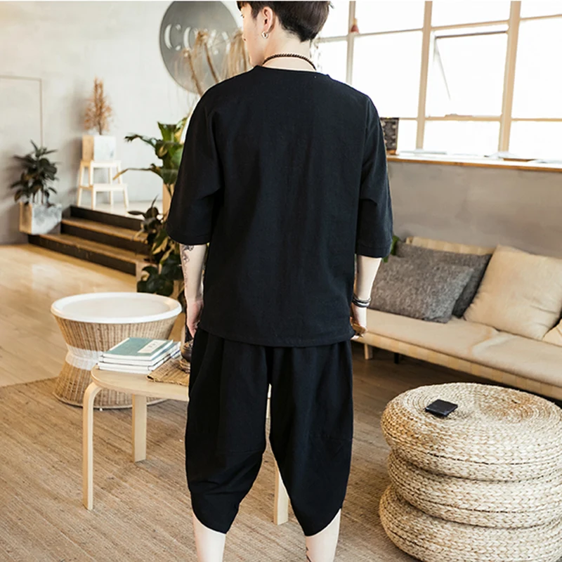 Комплект мужской из тонкого льна, свободные брюки средней длины в китайском стиле, 2 шт.компл., из хлопка и льна с коротким рукавом, A66, большие размеры, на лето