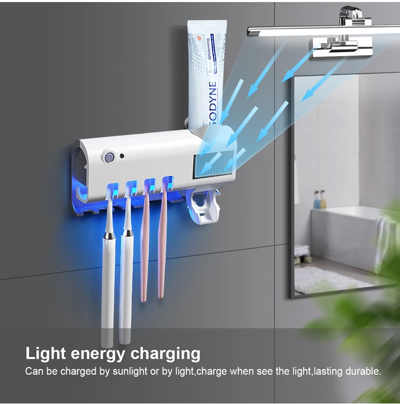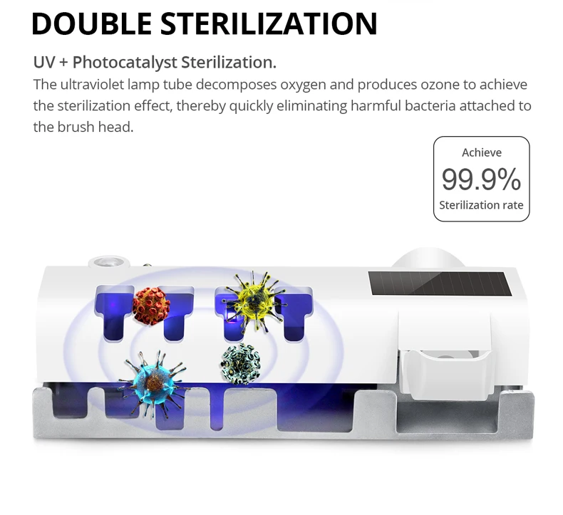 Особенности:1. Настенный УФ стерилизатор зубных щеток, легко прикрепить его к стене с помощью двусторонней клейкой ленты.2. Питание от солнечной энергии и домашнего освещения, не требуется штепсельная вилка и Нет батарей для замены, что является безопасным и экономичным.3. Инфракрасная интеллектуальная Сенсорная лампа в левом верхнем углу, инфракрасная Интеллектуальная Индукционная система обеспечивает эффективную стерилизацию, но Избегайте вредного УФ-светильник.Характеристики:Тип: стерилизатор зубной щетки UVCРежим: УФ + фоткаталитическая стерилизацияРабочее напряжение: DC3.7VРабочий ток: 320 мАНапряжение: USB кабель/Солнечная перезаряжаемаяЕмкость литиевой батареи: 1200 мАч (встроенный)Установка: НастенныйМатериал: АБС-пластикПосылка включает в себя:Стерилизатор зубной щетки-1 шт.1 х USB кабель1 комплект монтажных аксессуаров1 x Руководство пользователя