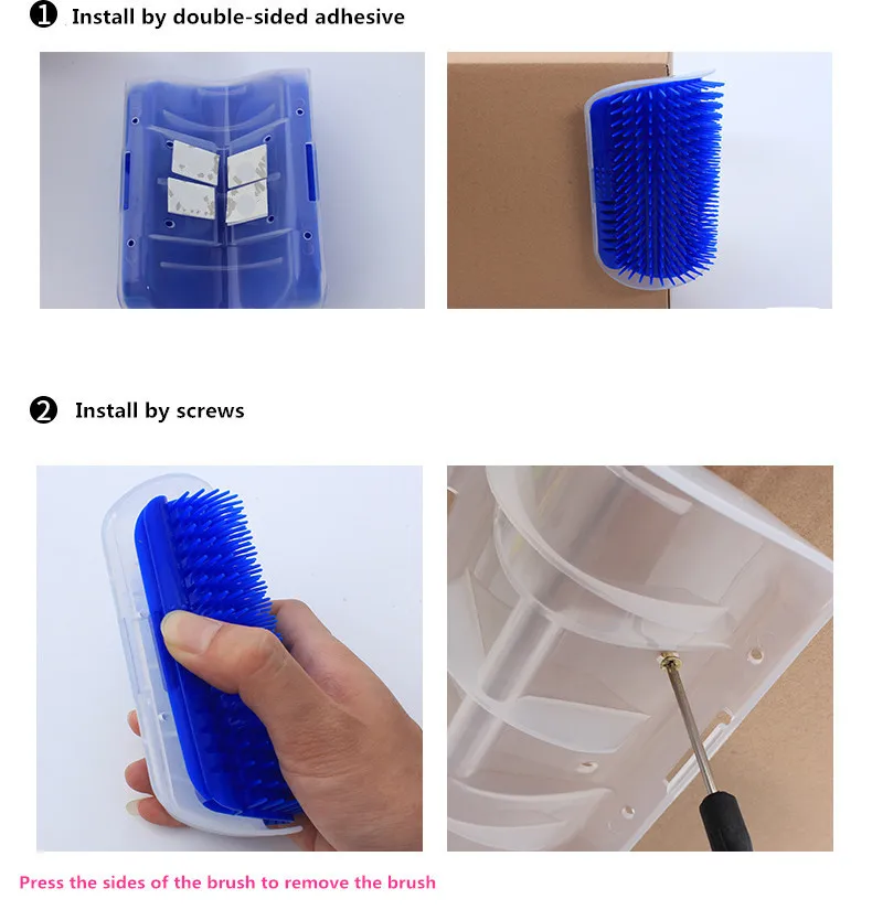 1. Это самоуход для кошек, который разработан в соответствии с образом жизни кошки. Он играет роль протирающего объекта для кошки, чтобы сделать их комфортными. 2. Почти подходит для всех углов стен, ножек стола и углов шкафа. Может быть легко установлен на плоских поверхностях или углах с помощью двухсторонних наклеек или винтов. 3. Эта угловая щетка для грумеров поможет удалить и собрать кошачьи свободные волоски, часть щетки может быть легко разобрана для очистки и повторно заблокирована на основании, удобна для длительного использования.