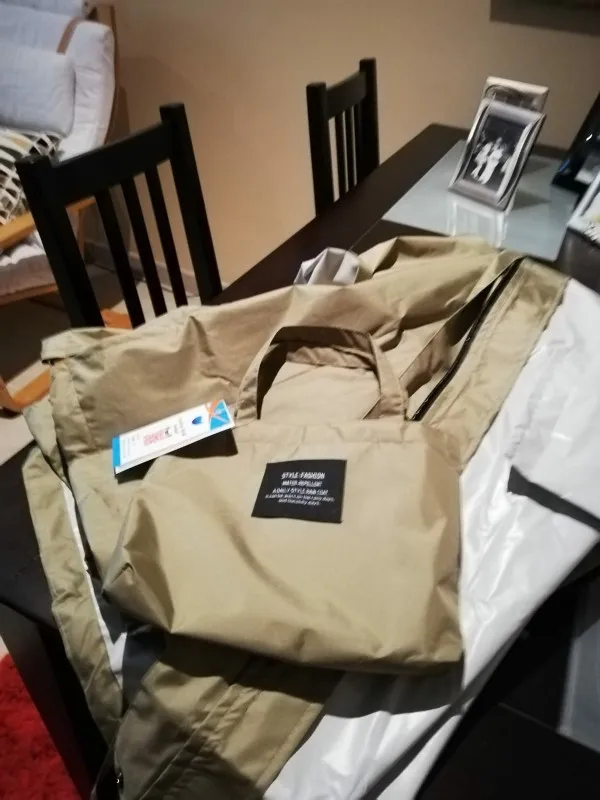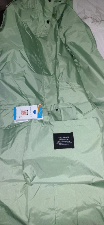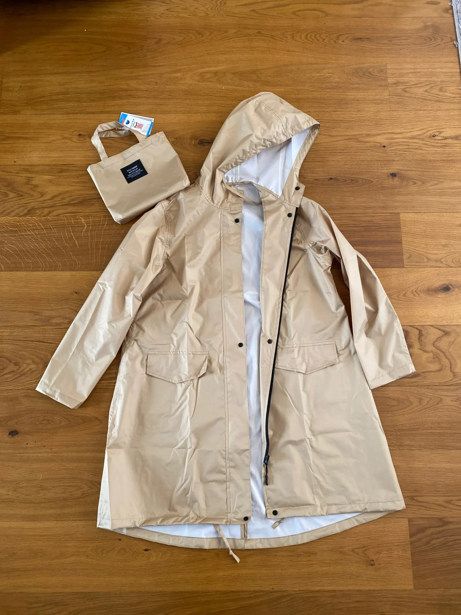 Пальто в очень приятной сумке. Пальто очень красивое и удобное. Цвет очень приятный на ощупь и без запаха. Я просто надеюсь, что это действительно будет работать под дождем из-за материала. Это не обычный дождевик. Я узнаю. Я доволен этим дизайном пальто и доставка тоже была очень быстрой. Спасибо!