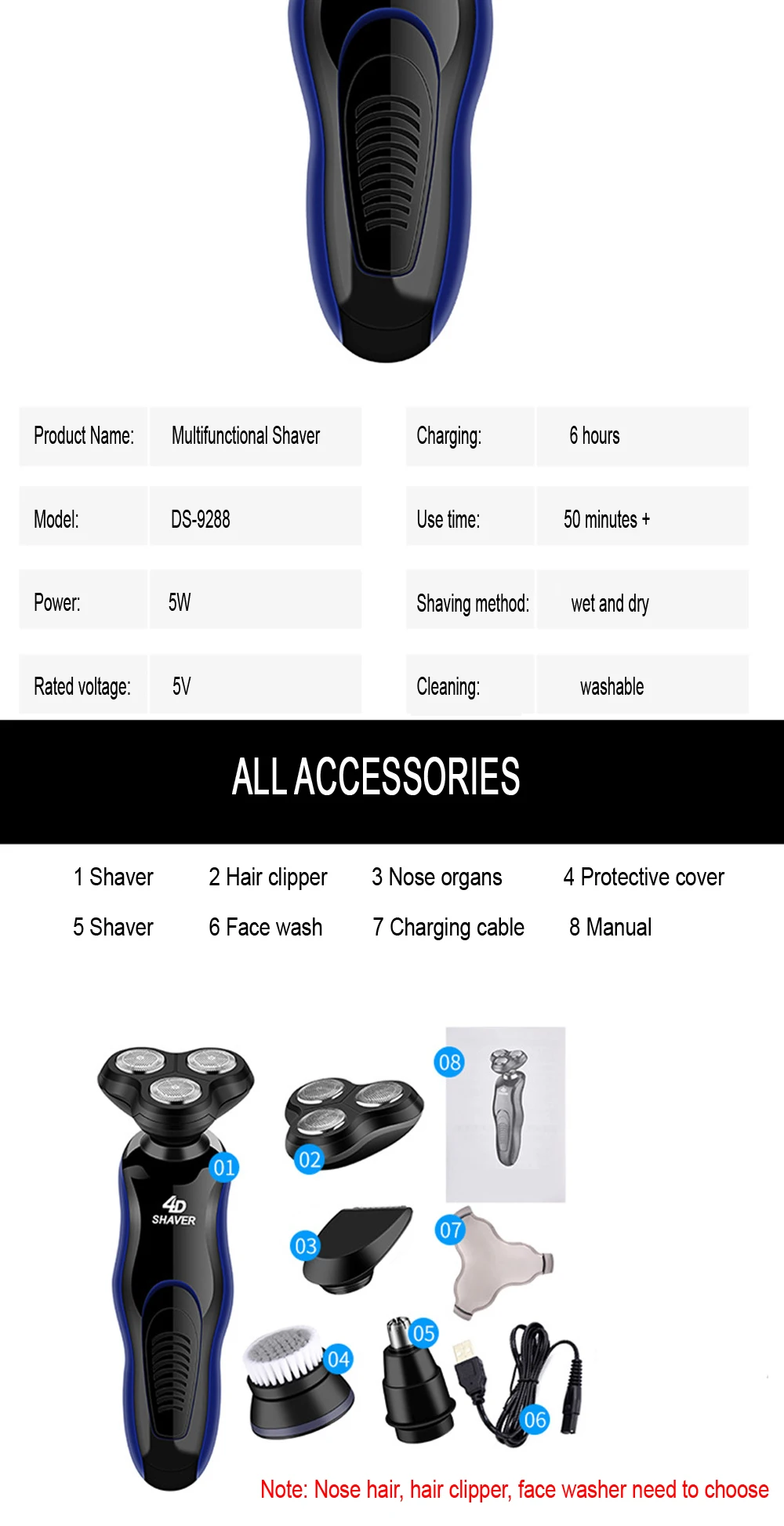 4 в 1: Электробритва * 1, триммер для волос * 1, триммер для бороды * 1, usb-кабель для зарядки * 1, щетка для очистки * 1LТаблица для всех контуров лица, более чистая.