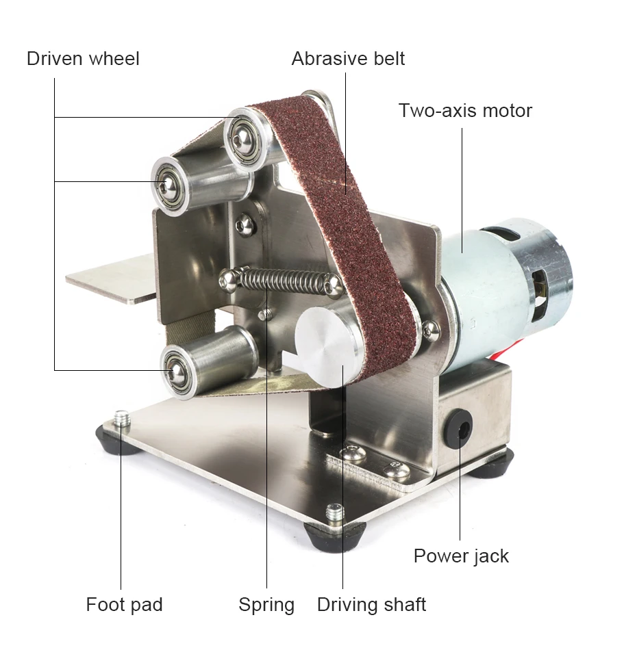 Особенности:Корпус изготовлен из нержавеющей стали лазерной резки, прочный и практичный.Угол рабочего стола можно регулировать по желанию, что делает его простым в использовании.Абразивные Ленточные колеса имеют встроенный двойной подшипник, нескользящую конструкцию и плавную работу.Двигатель использует двойные подшипники, высокую скорость, высокий крутящий момент и тише.Благодаря антивибрационным регулируемым подножкам по высоте вы также можете снять подножки и прикрутить машину к столу или дереву для удобного использования.Песочный пояс однородный, песок не теряет, более износостойкий.Характеристики:Материал: нержавеющая стальНапряжение: 110-240 В переменного токаНоминальное напряжение: 12-24 В постоянного токаСкорость вращения: 4000-9000 об/минРежим управления скоростью: 7 регулируемых передачЛенточный шлифовальный станок типа 15, размер ленты: 15*330 мм/0,6*120 дюйма (60/80/180/240/320/400/600/800/1000 меш)Ленточный шлифовальный станок типа 25, размер ленты: 25*330 мм/1,0*120 дюйма (60/80/180/240/320/400/600/800/1000 меш)Размер машины: 150*143*140 мм/5,9*5,6 * дюймаЛенточный шлифовальный станок типа 15 вес: 1059 г/фунтаЛенточный шлифовальный станок типа 25 Вес: 1094 г/фунтаПосылка: 202*190*160 мм/8,0*7,5 * 6.3inВес посылка:Тип 1: 1262 г/фунтаТип 2: 1526 г/3,3 фунтаТип 3: 1323 г/2,9 фунтаТип 4: 1588 г/фунтаПримечание:Тип 1 и тип 3 должны подготовить источник питания постоянного тока 12-24 В, 5 А самостоятельно.Посылка тация: (необязательно)Тип 1:1 ленточная шлифовальная машина типа 1510 * песочный пояс3 * гаечный ключТип 2:1 ленточная шлифовальная машина типа 151 * источник питания с контролем скорости10 * песочный пояс3 * гаечный ключТип 3:1 ленточная шлифовальная машина типа 2510 * песочный пояс3 * гаечный ключТип 4:1 ленточная шлифовальная машина типа 251 * источник питания с контролем скорости10 * песочный пояс3 * гаечный ключ