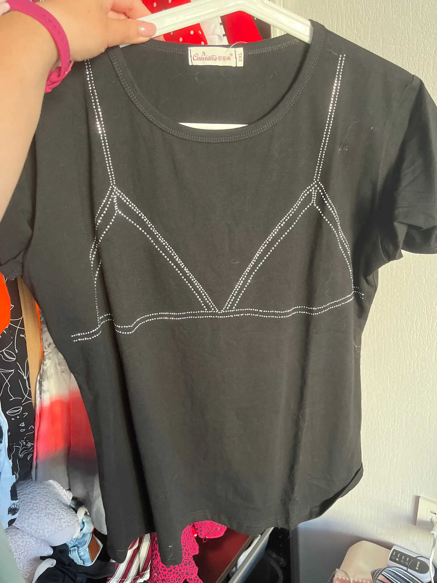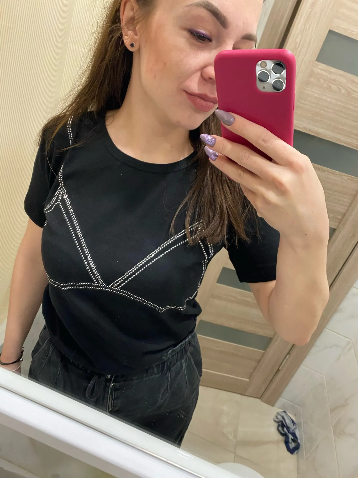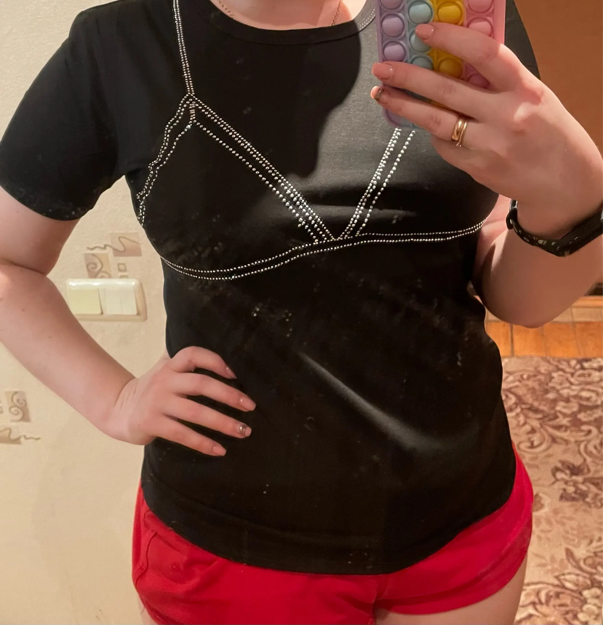 Не соответсвует фотографии , но футболкой я довольна. Она короче, чем на заявленной картинке. Плотная, хлопковая , строчки ровные, нитки не висят . Стразы визуально качественно приклеены, а как при носке и стирке будет - посмотрим ))
