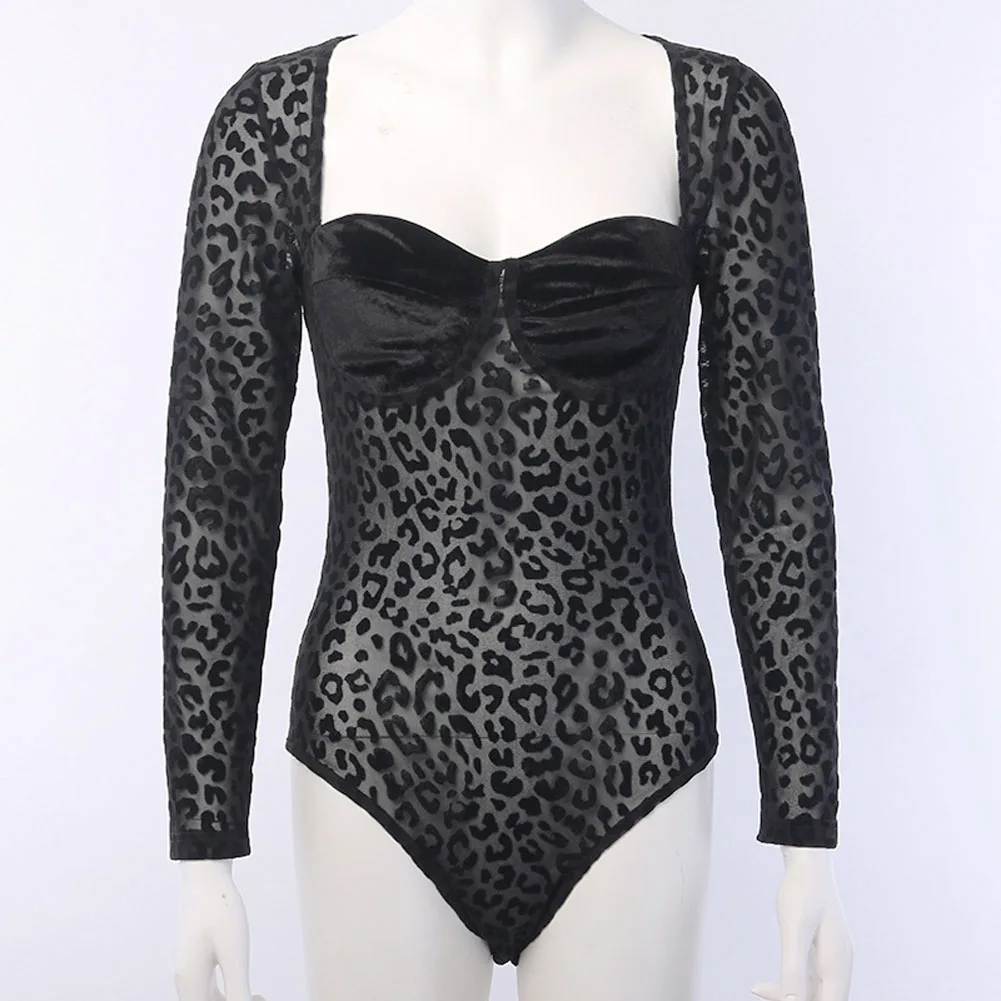 Женский комбинезон с длинным рукавом Meihuida, Леопардовый прозрачный тонкий комбинезон с квадратным вырезом, Клубная одежда для секса