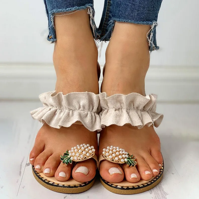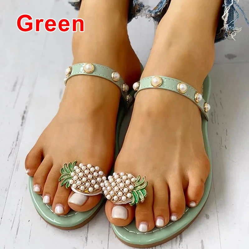 Сандалии женские с ананасом и жемчугом, плоская подошва, модные пля...