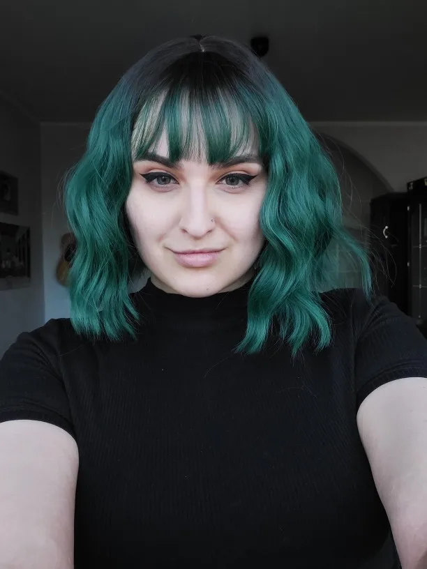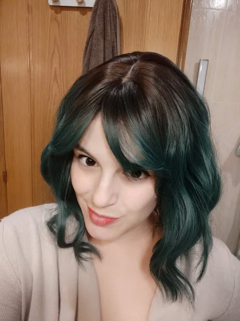 Действительно красивый парик! Думаю, что он выглядит реалистично, совсем не блестит. Мне нравится цвет и волны. Я немного обрезала челку, чтобы она подходила лучше. Но 10/10 отличное соотношение цены и качества и натуральный цвет корня :)