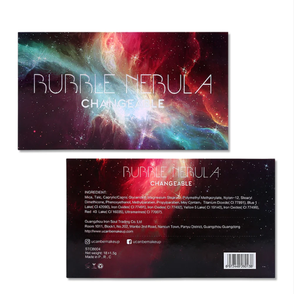 Посылка: 1 шт. сменная палитра теней для век 18 цветовКакие оттенки входят в палитру?9 масляных матов6 блестящих кремовых металлов1 Блестящий интенсивный порошок2 прозрачные Светоотражающие тениОсобенности:1. Палитра состоит из 18 мечтательных оттенков, упакованных с невероятным спектром привлекательных палитр, она полна космоса, галактического синего и танталлизационных чаев, которые создают бесконечные цветовые комбинации.2. Выделяющиеся оттенки в пузырчатой туманности палитра: мятно-зеленый и чрезвычайно мерцающий павлин синий3. Розовый, синий и фиолетовый цвета являются кивком к тому, как стразы переключают цвета в зависимости от того, как светильник попадает в них.4. Много многоотражающих и стеклянных блестящих порошков, чтобы еще больше приносить этот потрясающий кристальный блеск, блеск и сияние в жизнь.